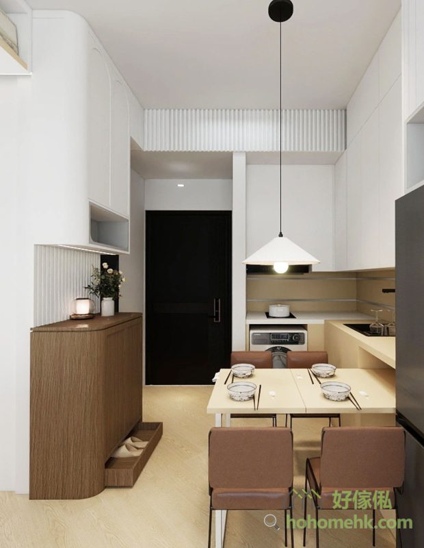 廳櫃的設計中,運用了拼色技巧,吊櫃及到頂櫃採用白色,而地櫃則選用深木色,營造出鮮明的層次感。不僅提升視覺美感,還能讓空間更具深度。這種設計特別適合台灣的現代家居風格,既優雅又不失實用性。