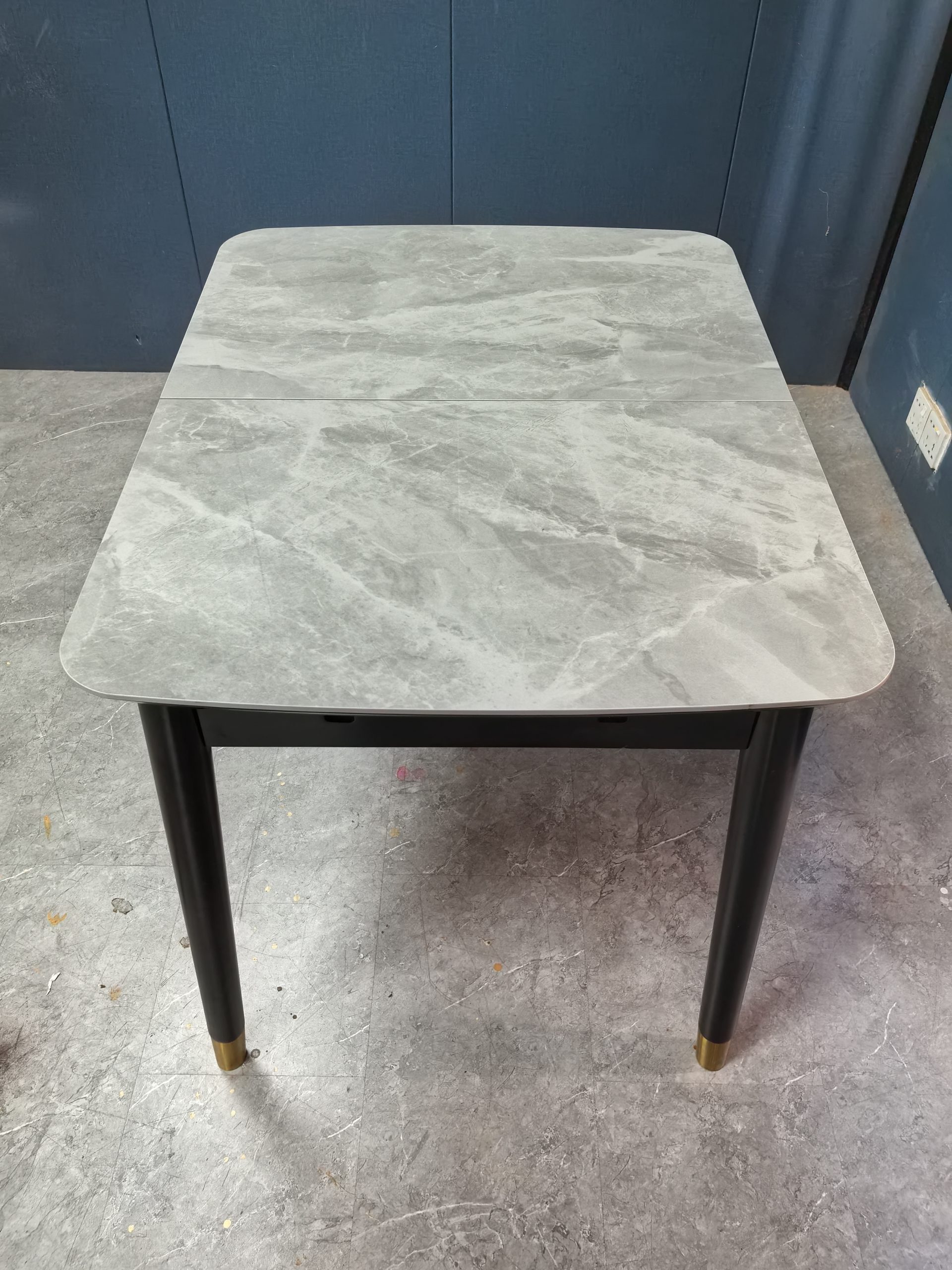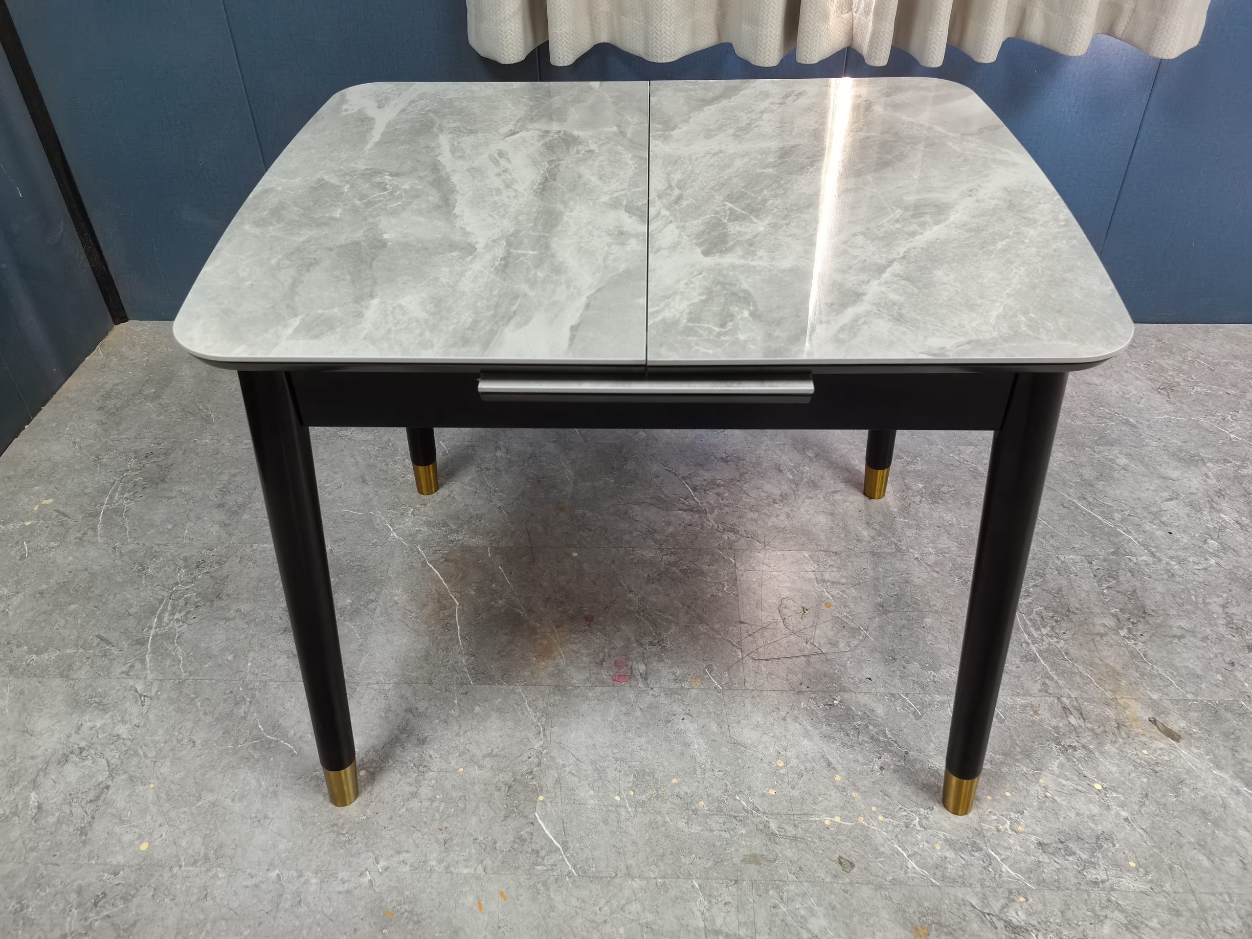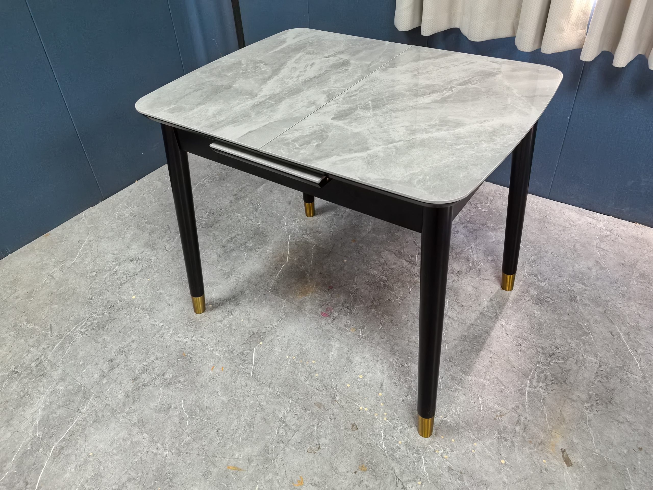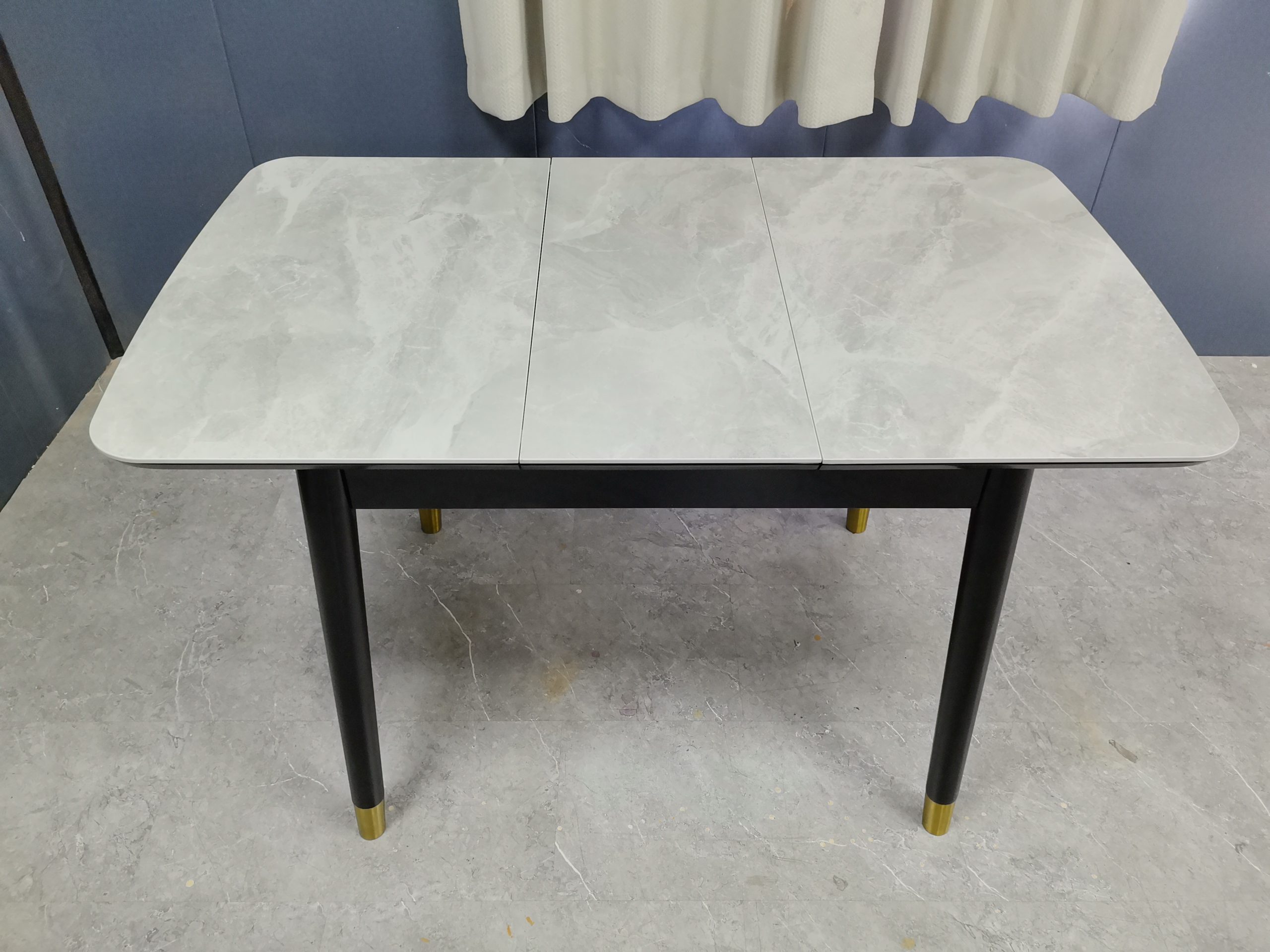 工廠實拍: Lillian實木岩板餐枱,收起0.9米,打開1.2米長,亮光意大利灰岩板,配黑腳