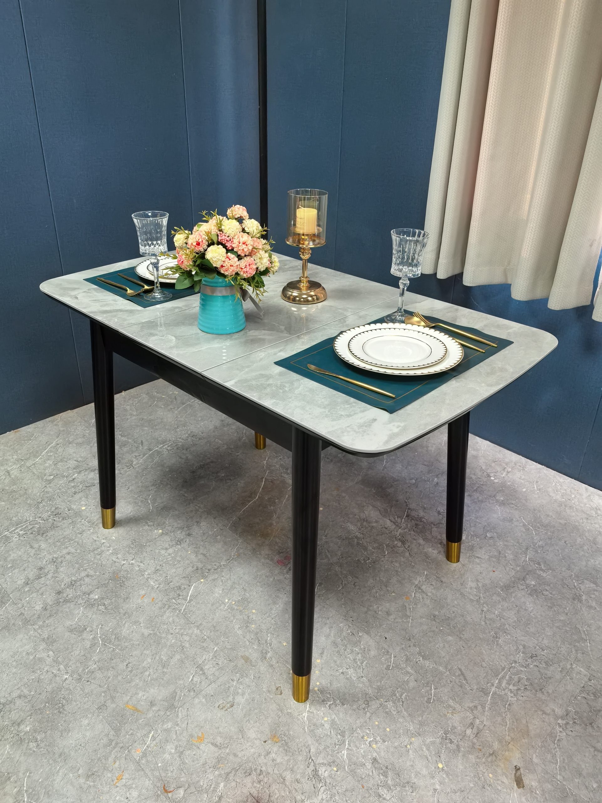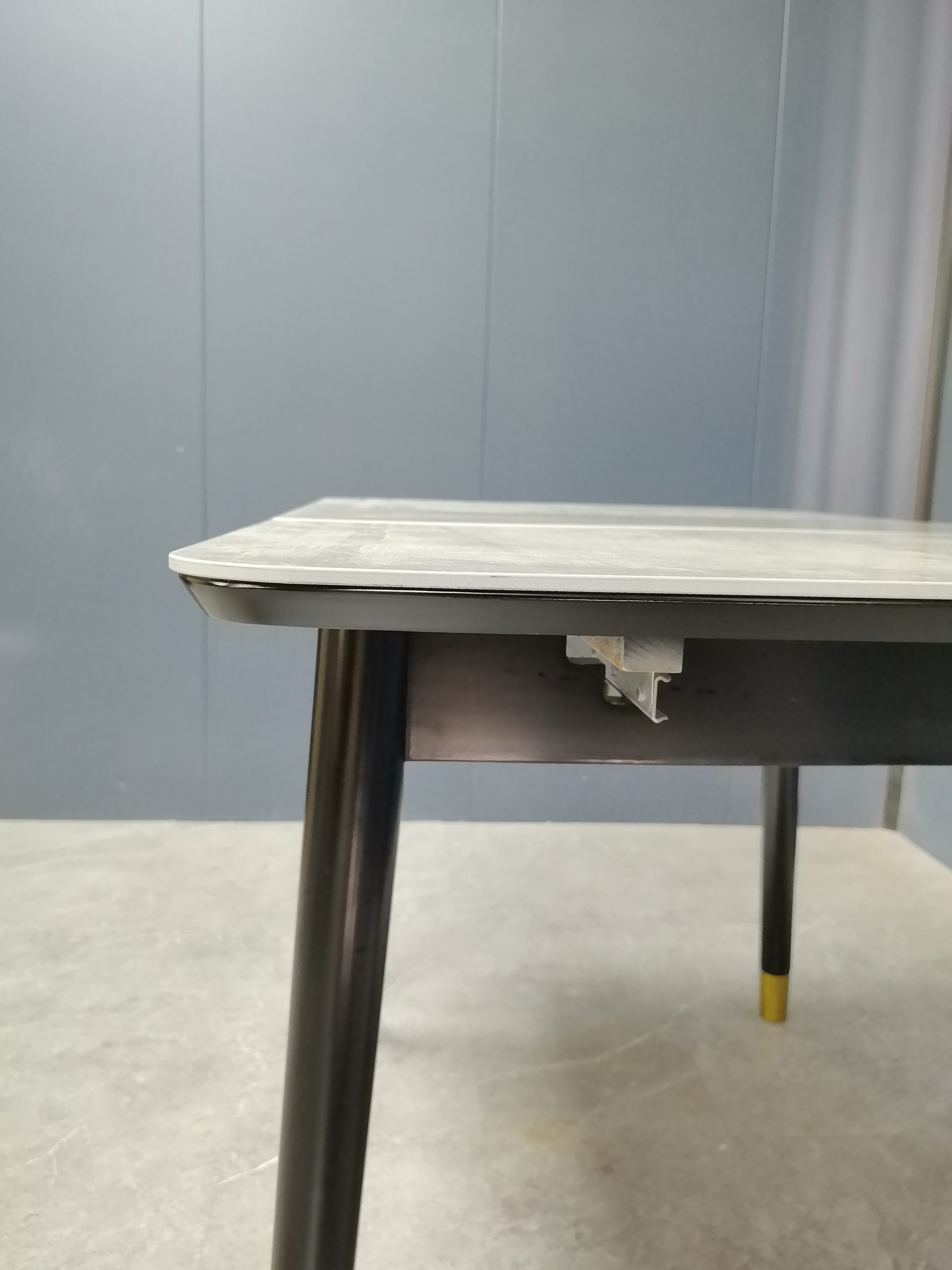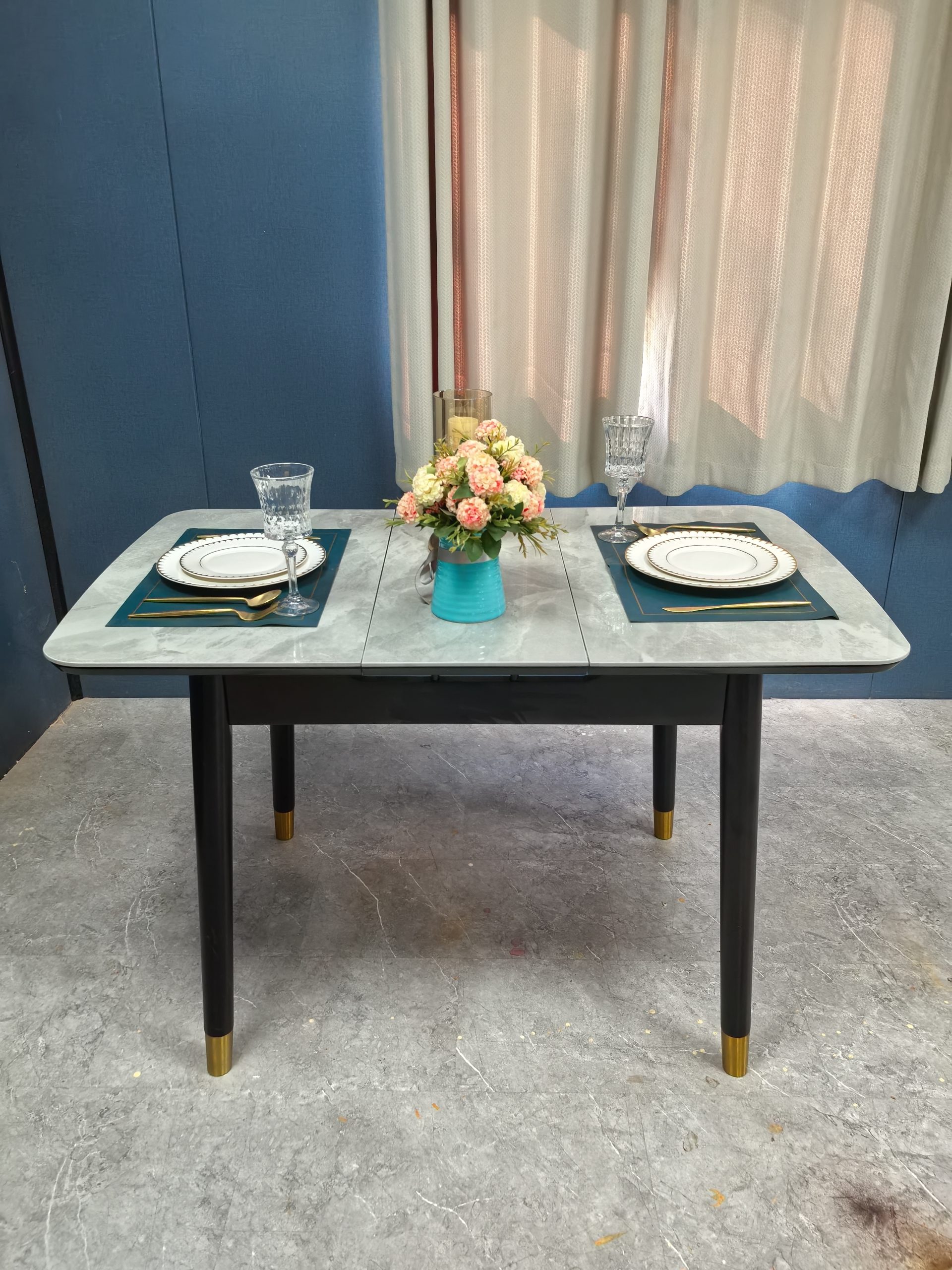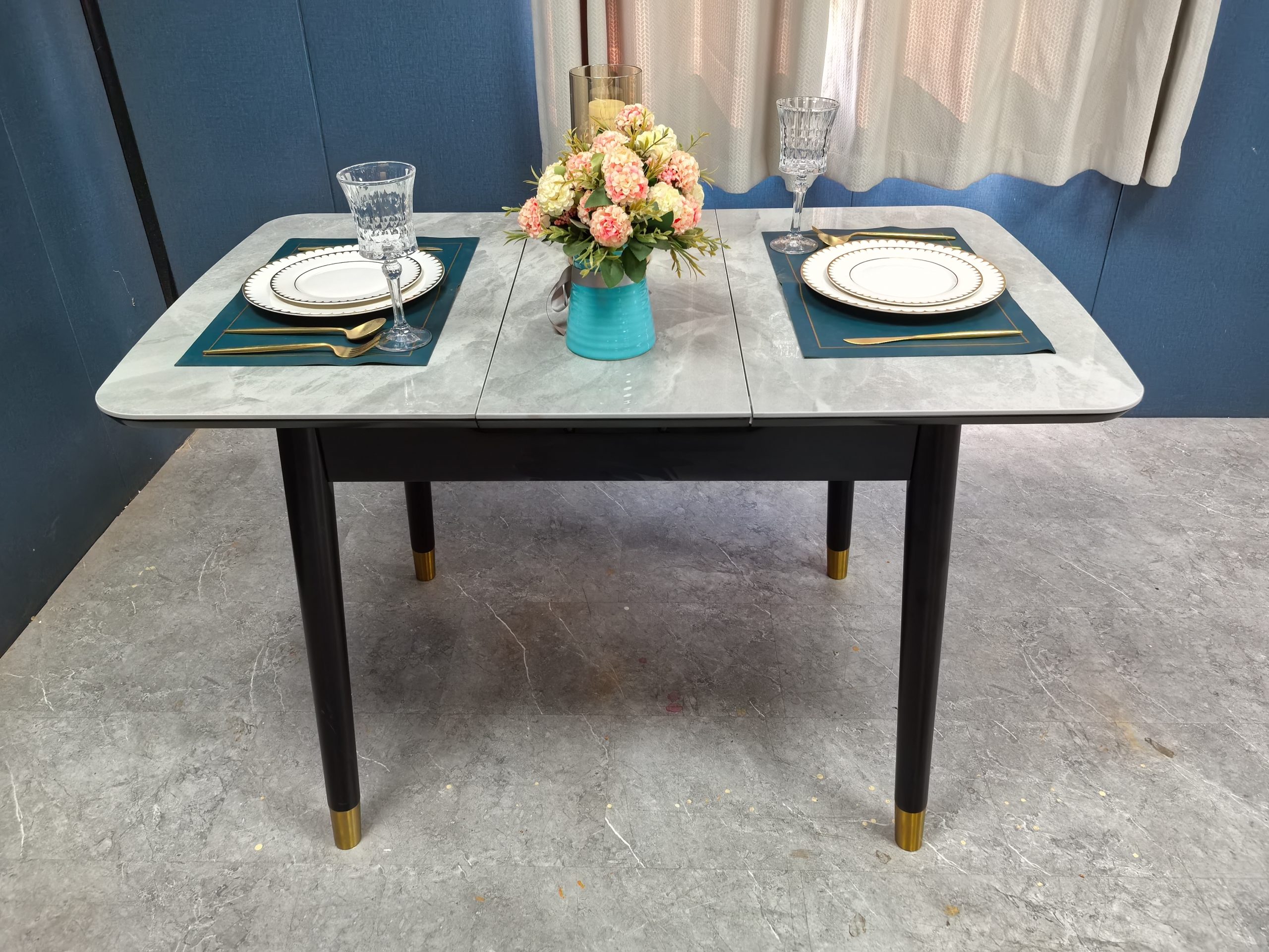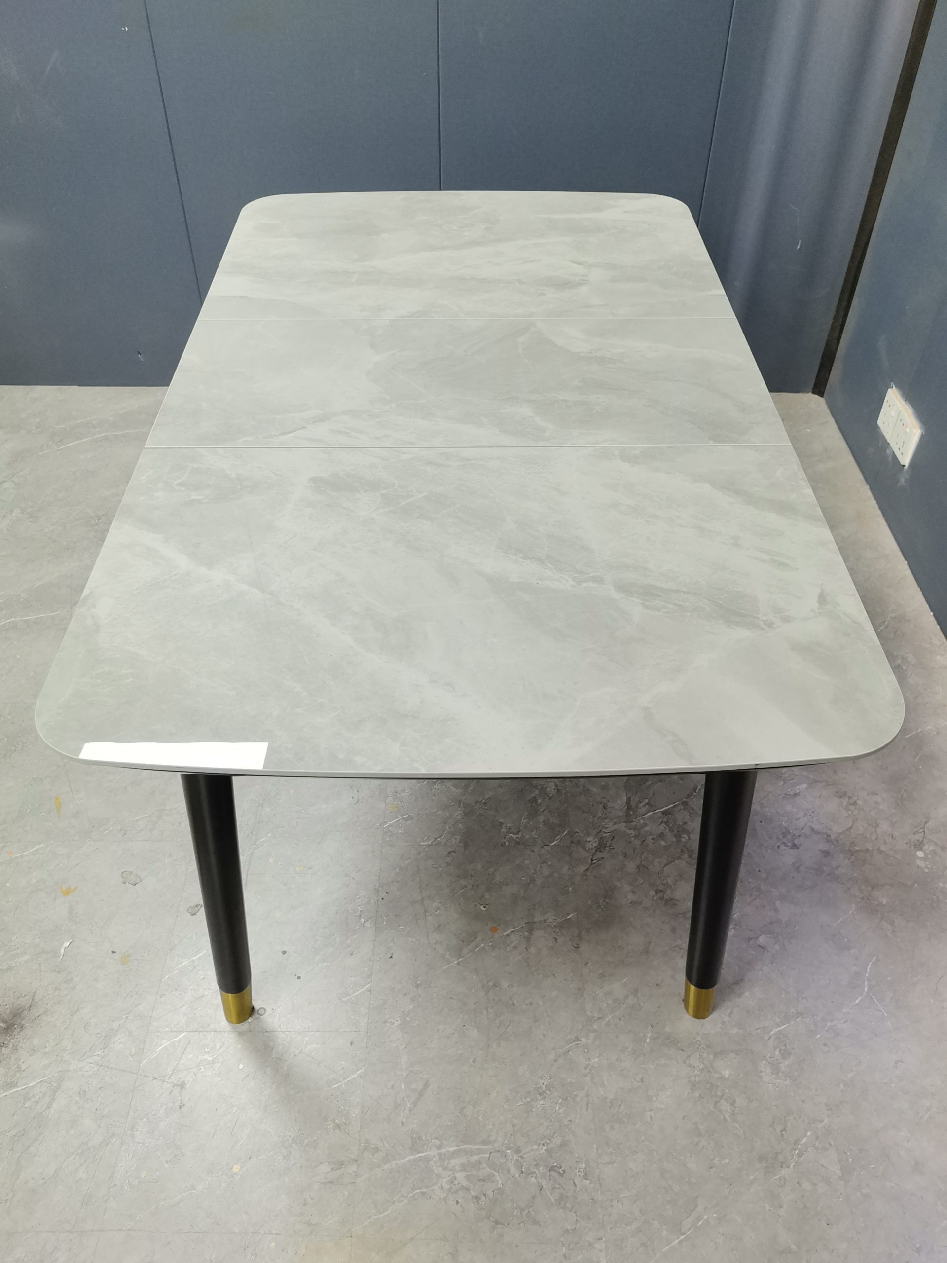 工廠實拍: Lillian實木岩板餐枱,收起0.9米,打開1.2米長,亮光意大利灰岩板,配黑腳