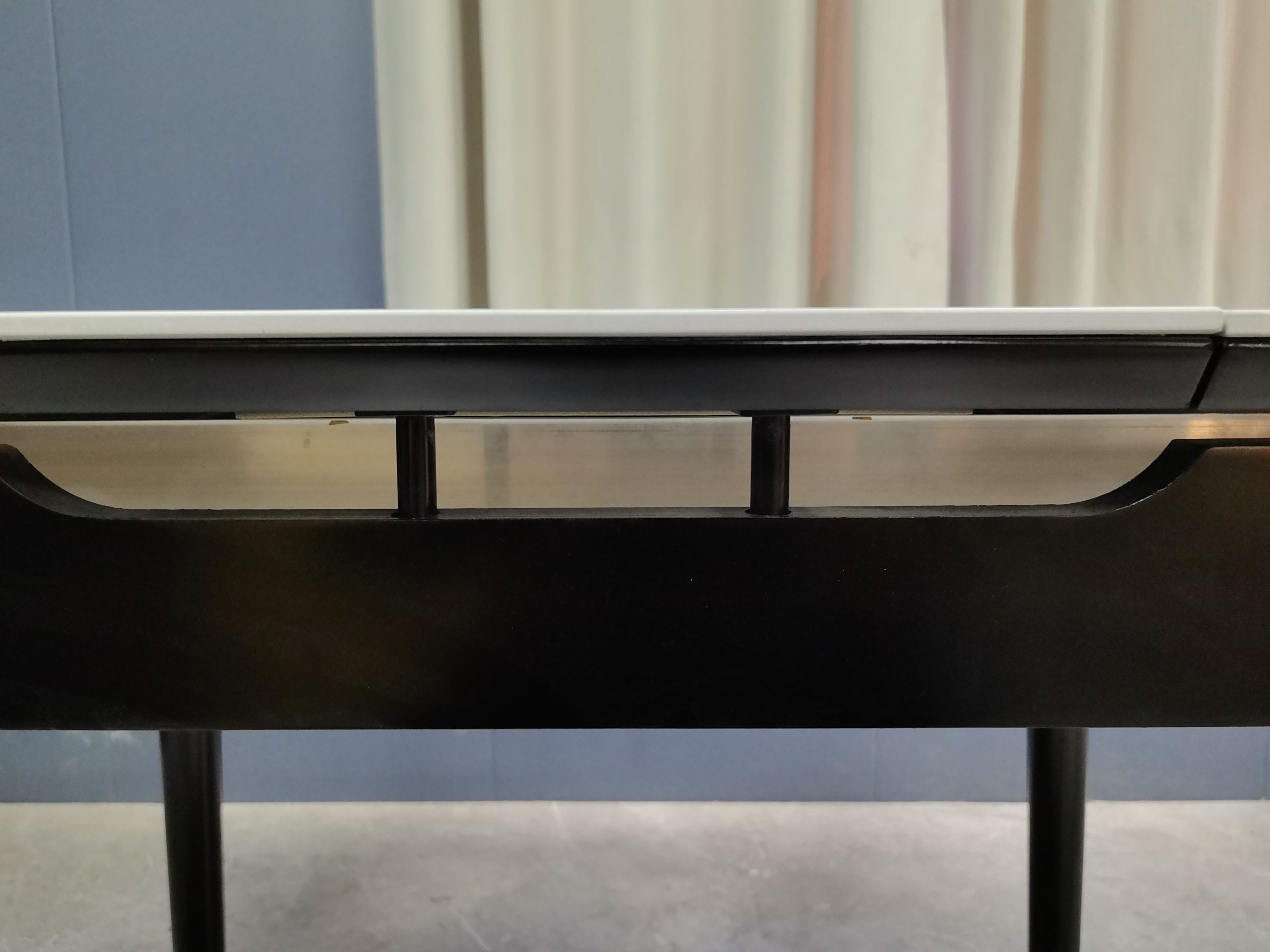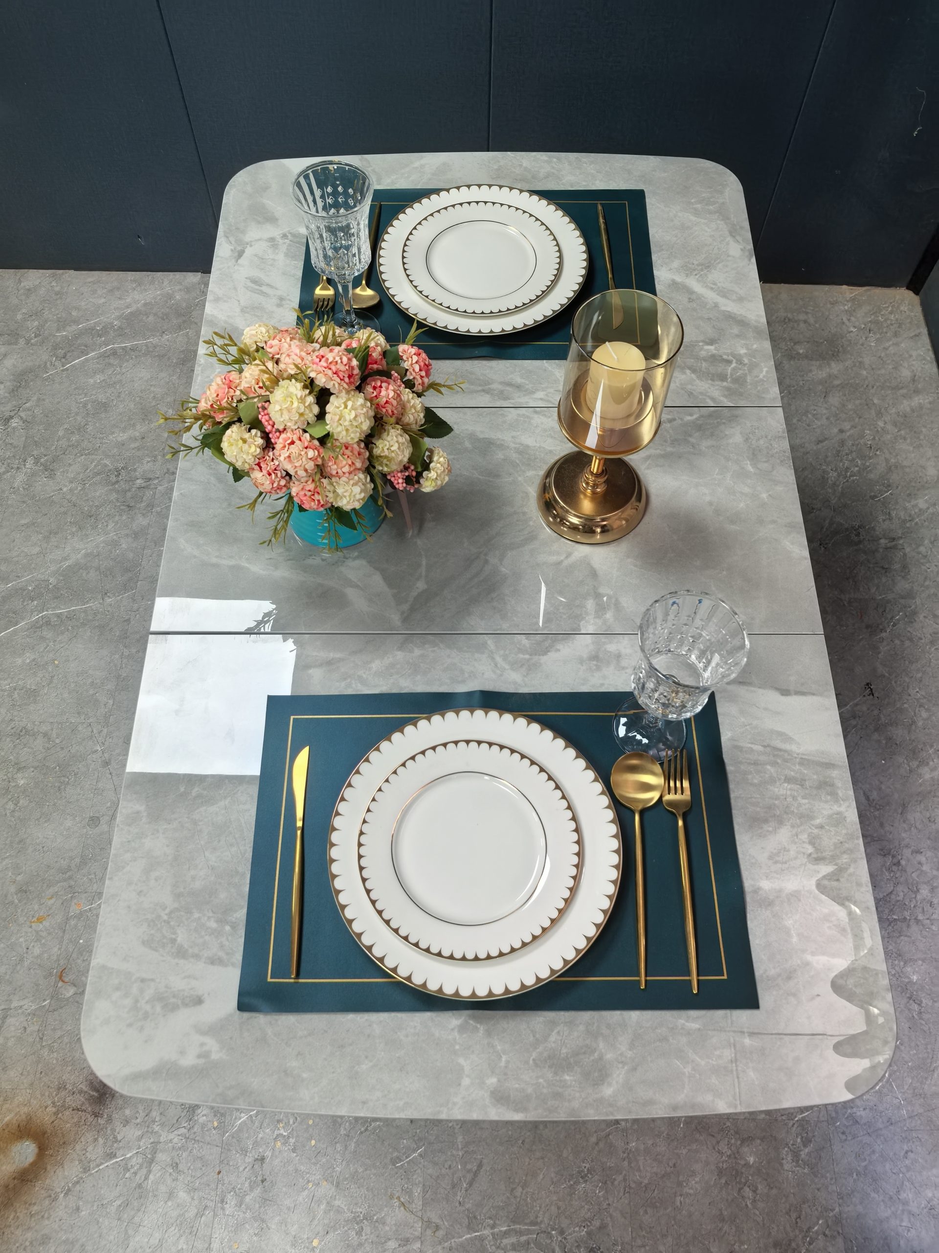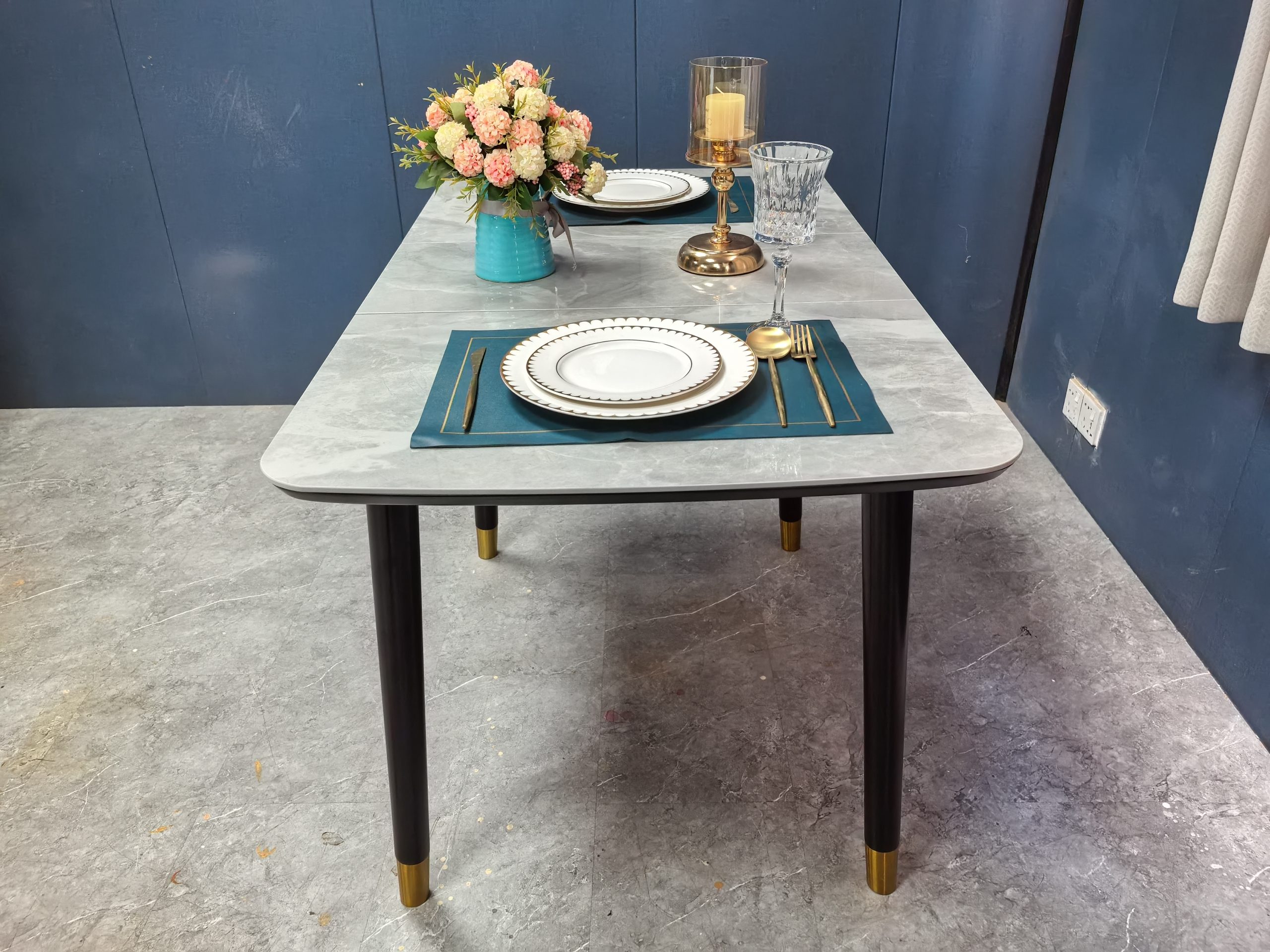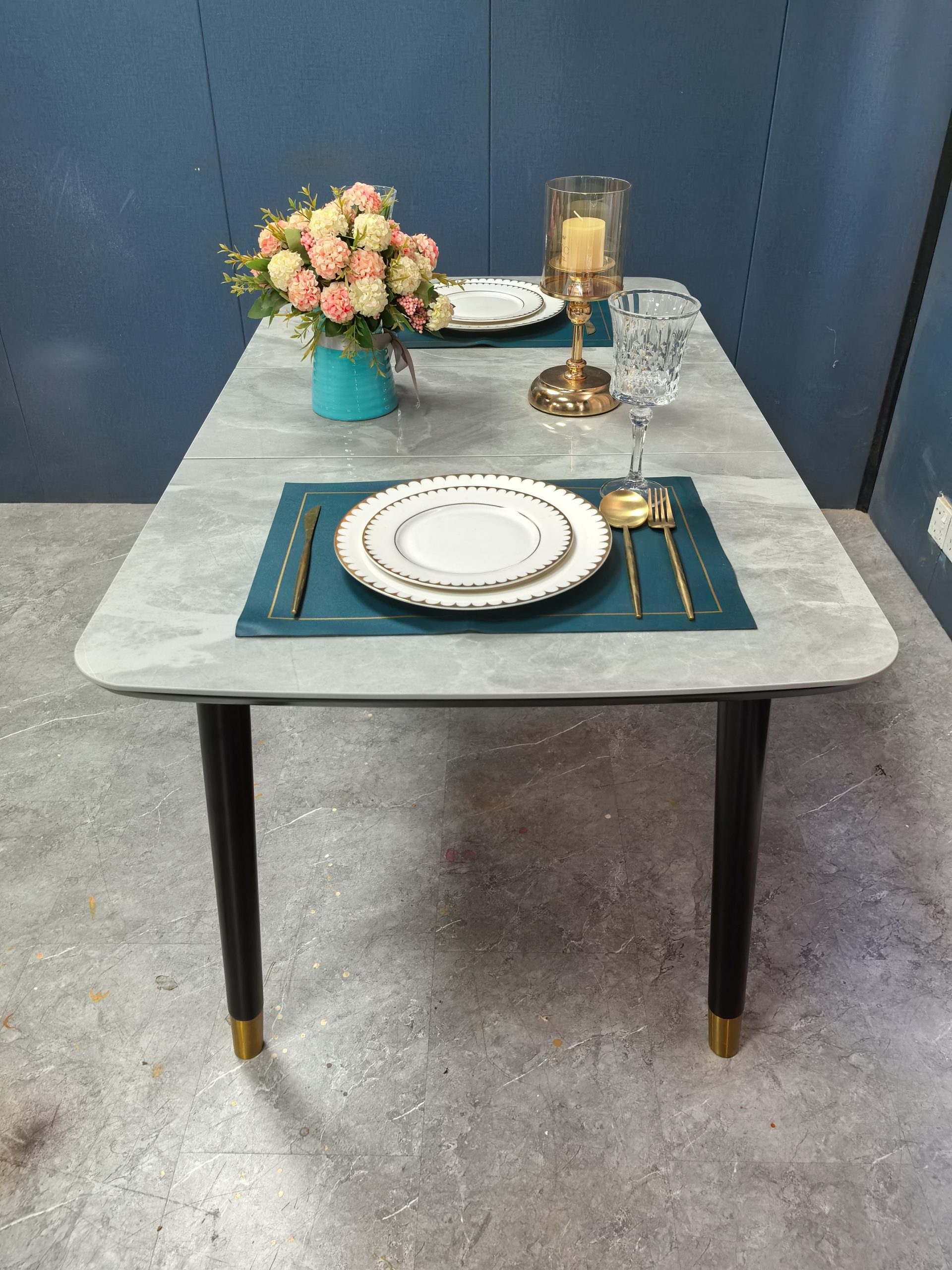 工廠實拍: Lillian實木岩板餐枱,收起0.9米,打開1.2米長,亮光意大利灰岩板,配黑腳