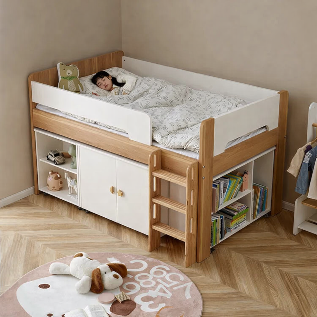 床下設有防塵衣櫃、儲物櫃同開放式書架,衫、玩具、書全部有位擺,整齊又易拎。唔使再另外買櫃,慳位又慳錢,好適合想簡單又實用嘅家庭。