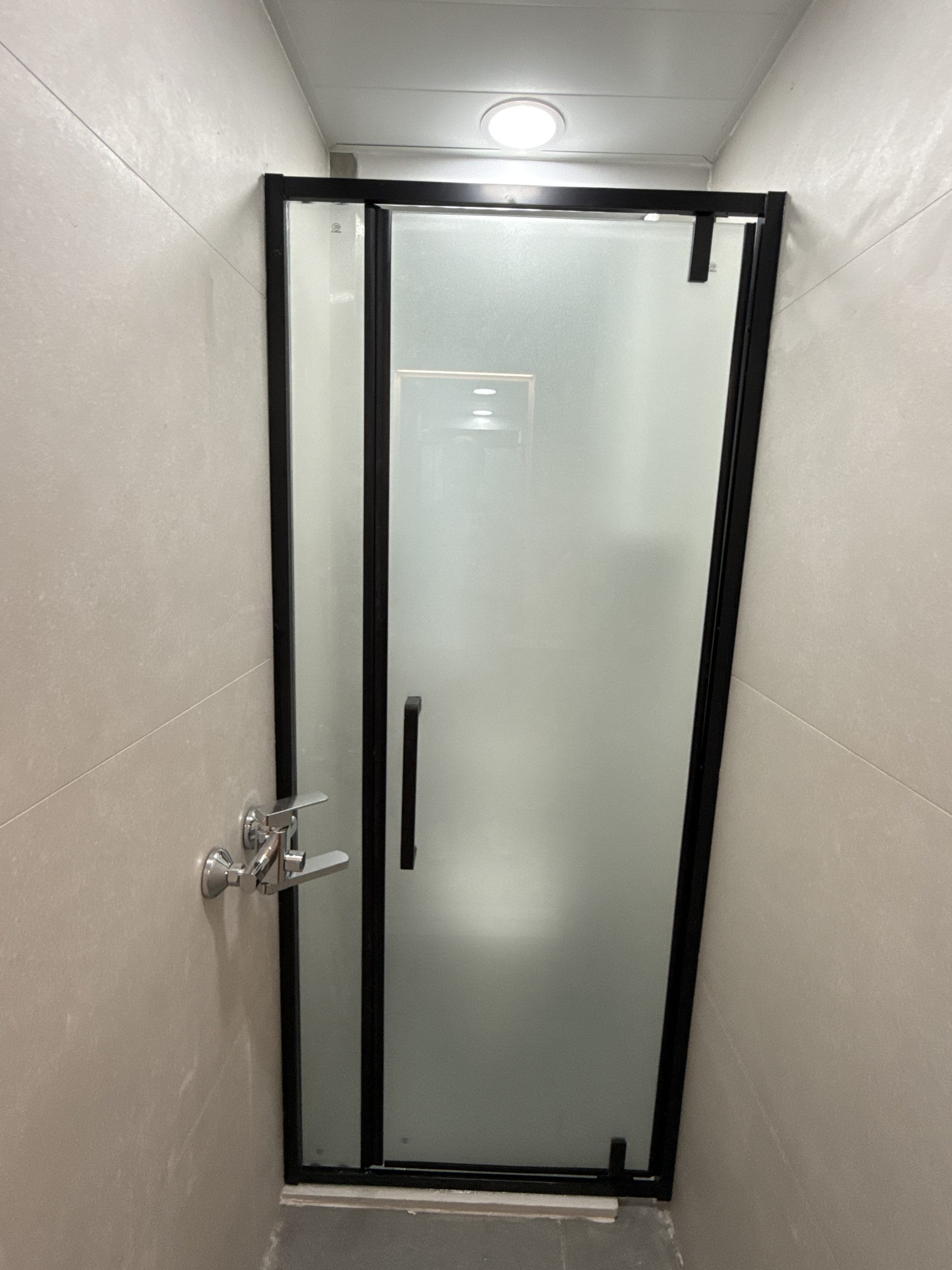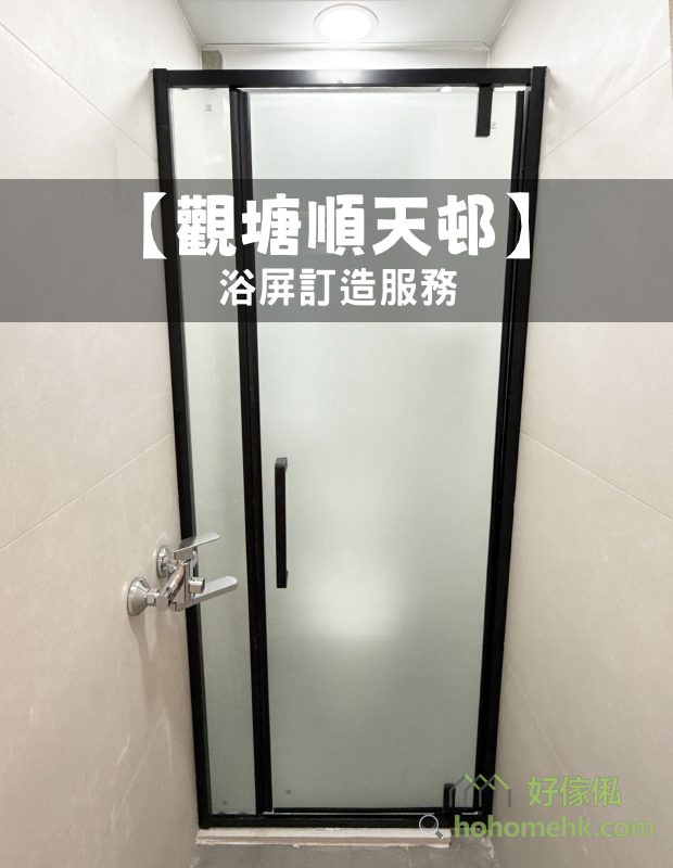 觀塘順天邨浴屏客製化服務 (不銹鋼框,啞黑,單開門,配磨砂玻璃),包送貨及安裝,可升級清拆及棄置舊浴屏選項。單開門浴屏款式,非常慳位,公屋廁所都可以做到乾濕分離,提升生活質素。