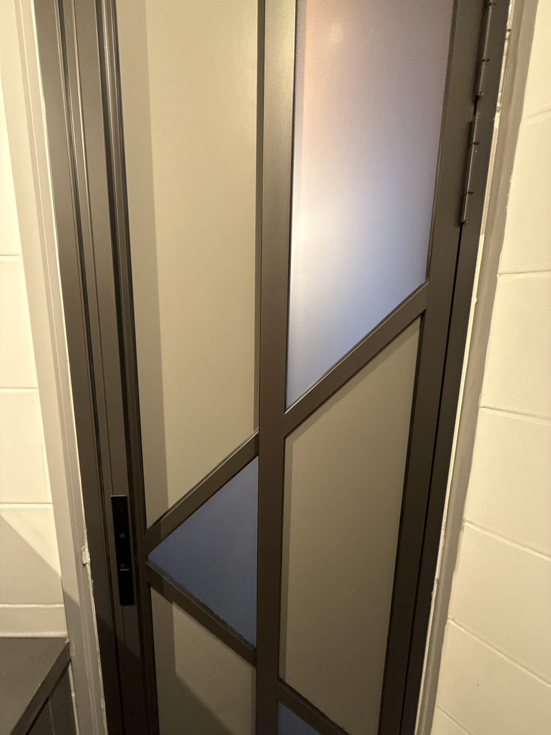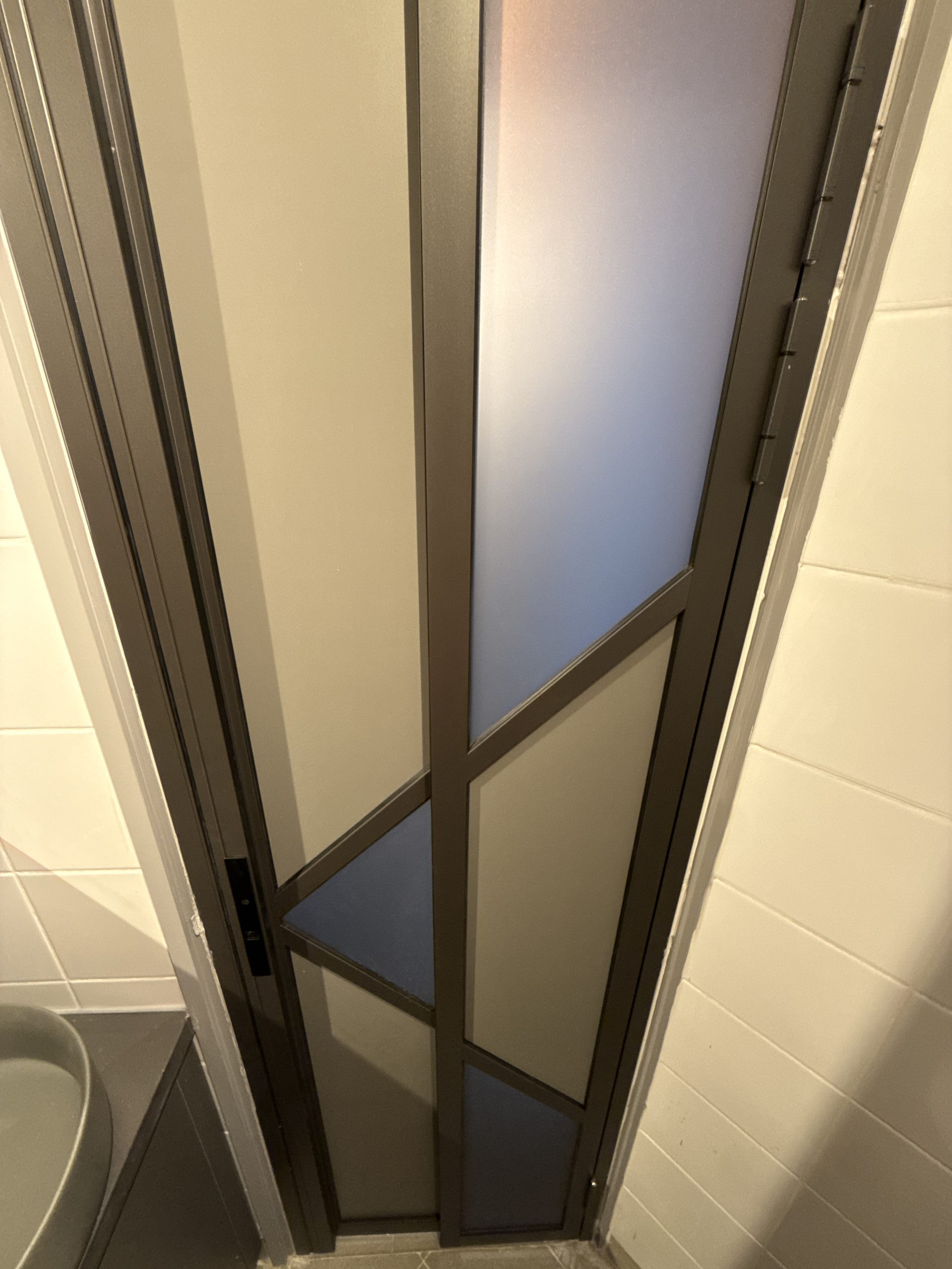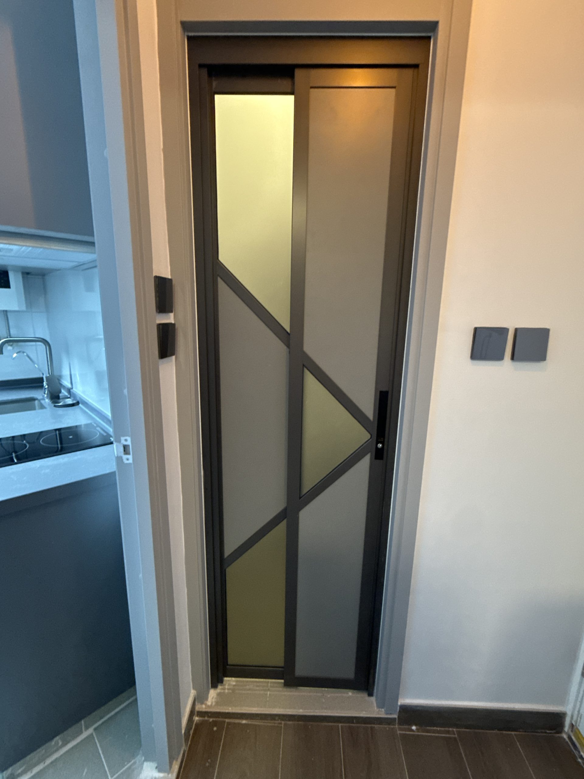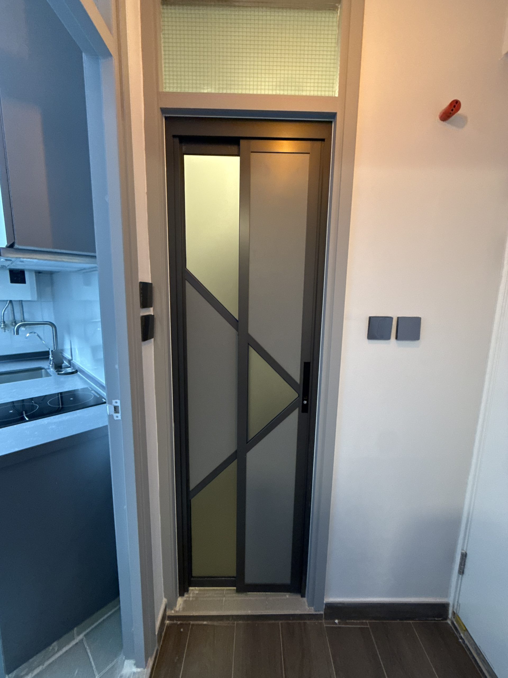 門洞不夠大,廁所可以客製化PD門代替普通的掩門,更加慳位,同時保留更大的開門位置。客製化PD門時,廁所用磨砂玻璃+不透明的鋁板就可以提升私隱度。