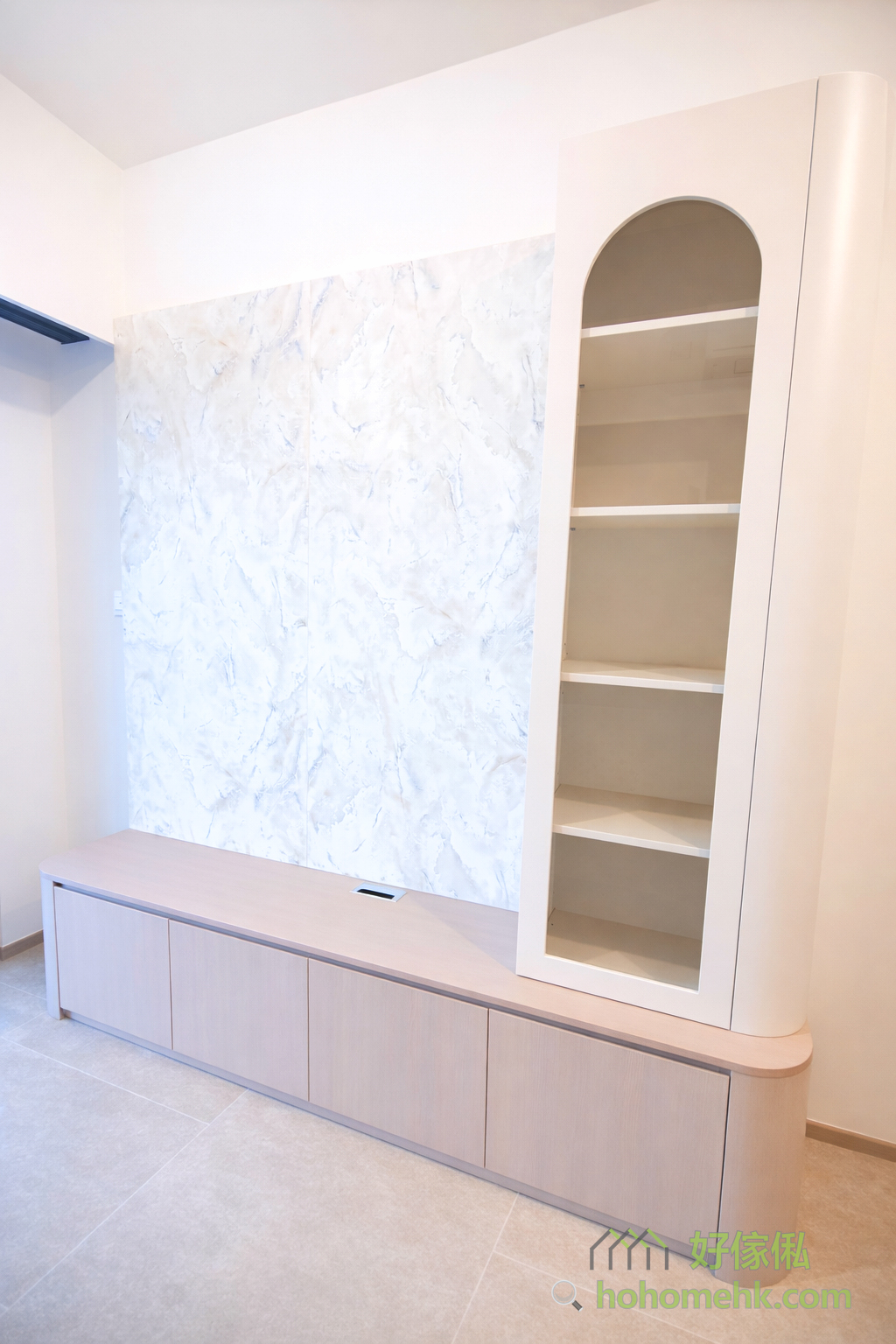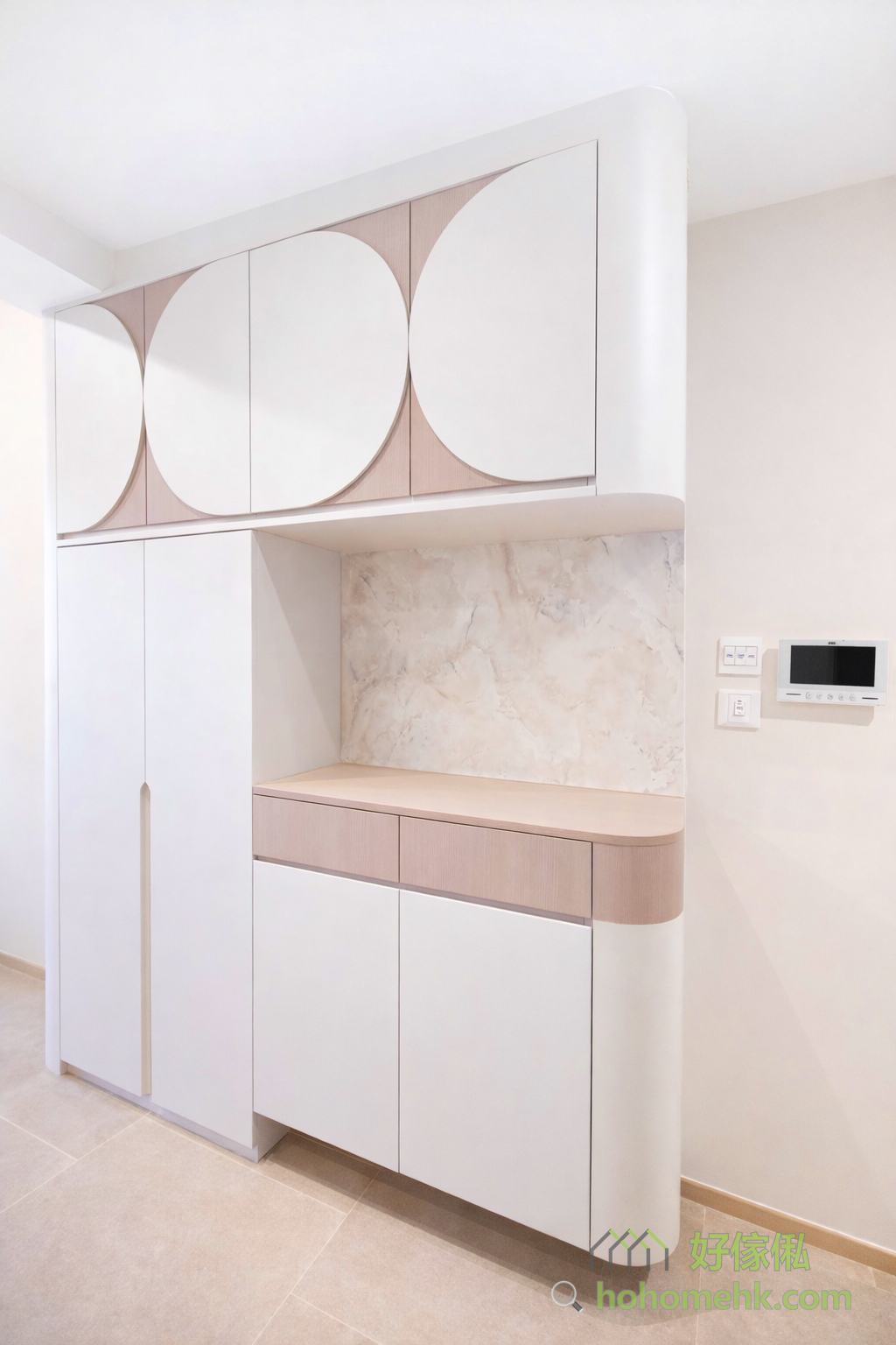 客廳的C字櫃以獨特的門板造型成為視覺焦點,設計簡約而不過時,完美融合時尚與實用性。其柔和的圓弧線條和淺色調,營造出溫暖舒適的家居氛圍,適合不同風格的室內設計,無論是現代還是經典。