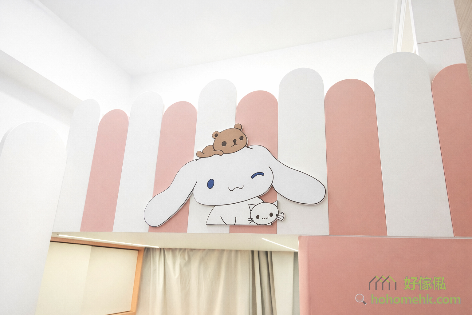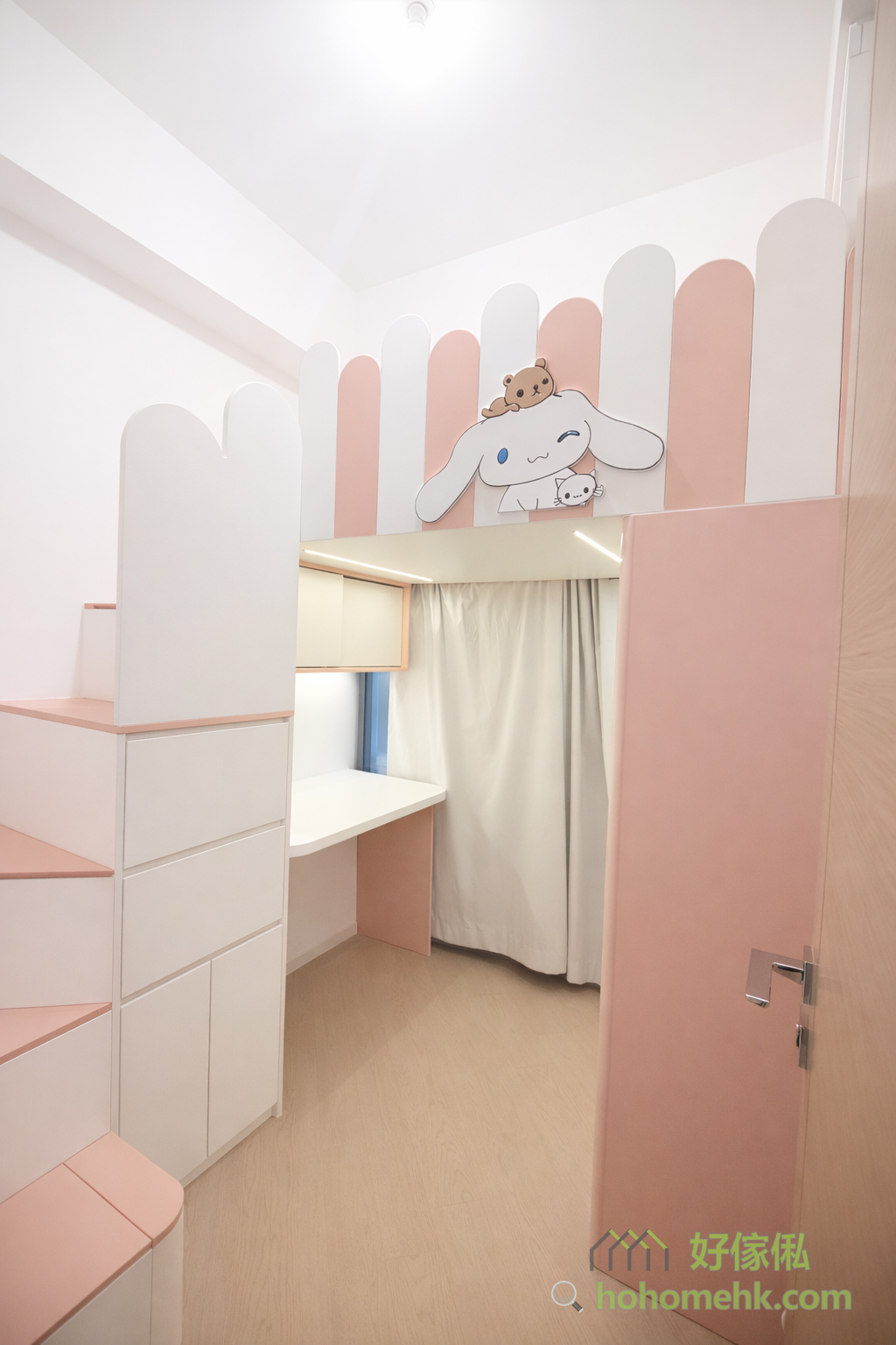 小朋友房以粉紅和白色的經典配搭為主,並加入小朋友喜愛的卡通人物造型 — 玉桂狗,整體充滿童趣與活力。這樣的設計不僅能讓孩子擁有愉快的童年記憶,還能激發他們的創造力和想像力。同時,收納櫃和書桌的設置,亦能滿足學習與儲物的需求,為孩子打造一個多機能空間。