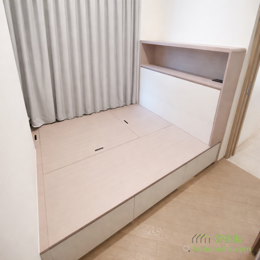 主人房的設計以簡單舒適為主,注重實用性。衣櫃採用拼色門板設計,既避免了單調感,又保留了簡約風格的核心,為空間注入一份和諧感。地台床和隱藏式儲物設計,則令房間更加整齊有序,營造出舒適的休息環境。