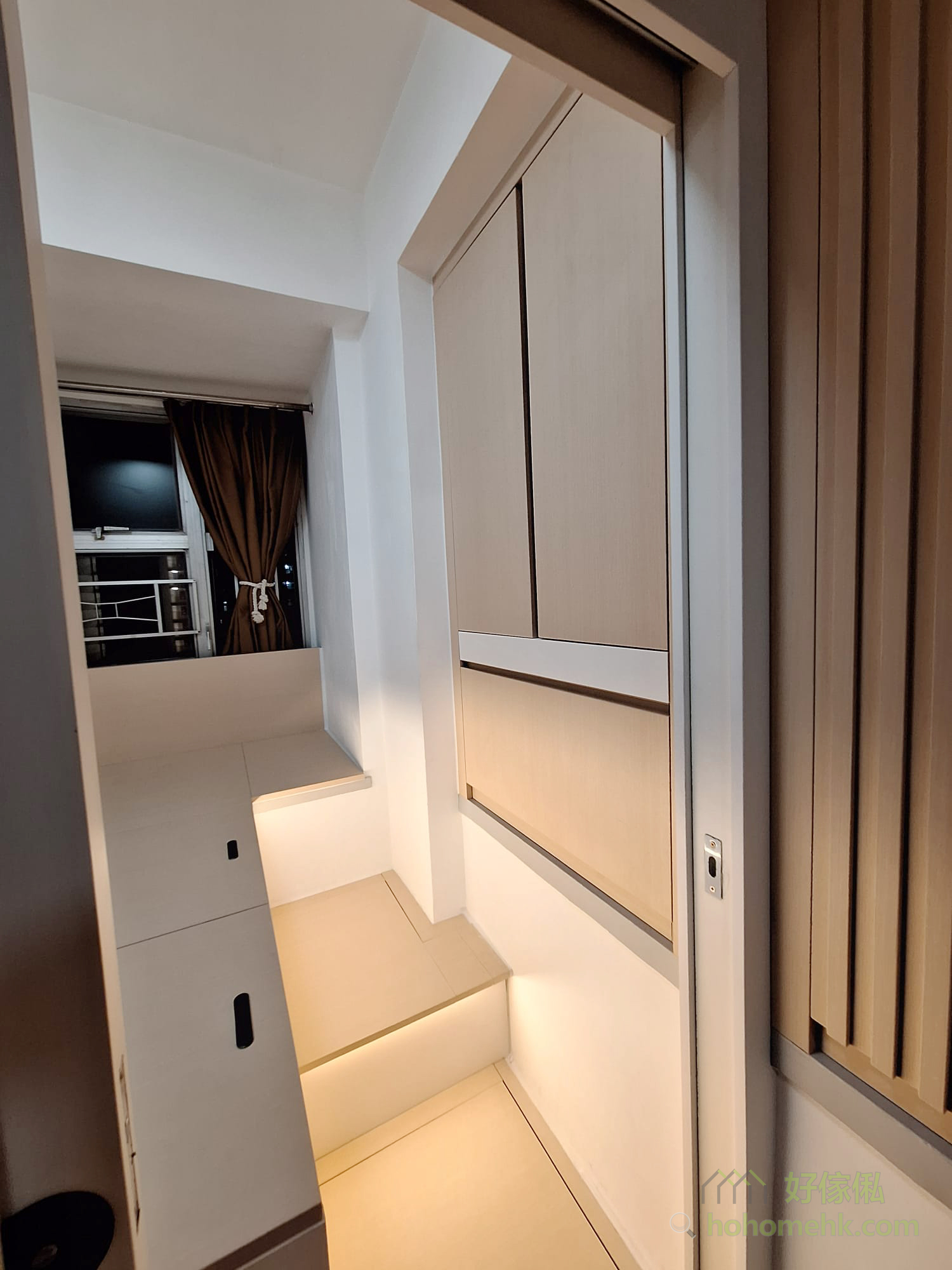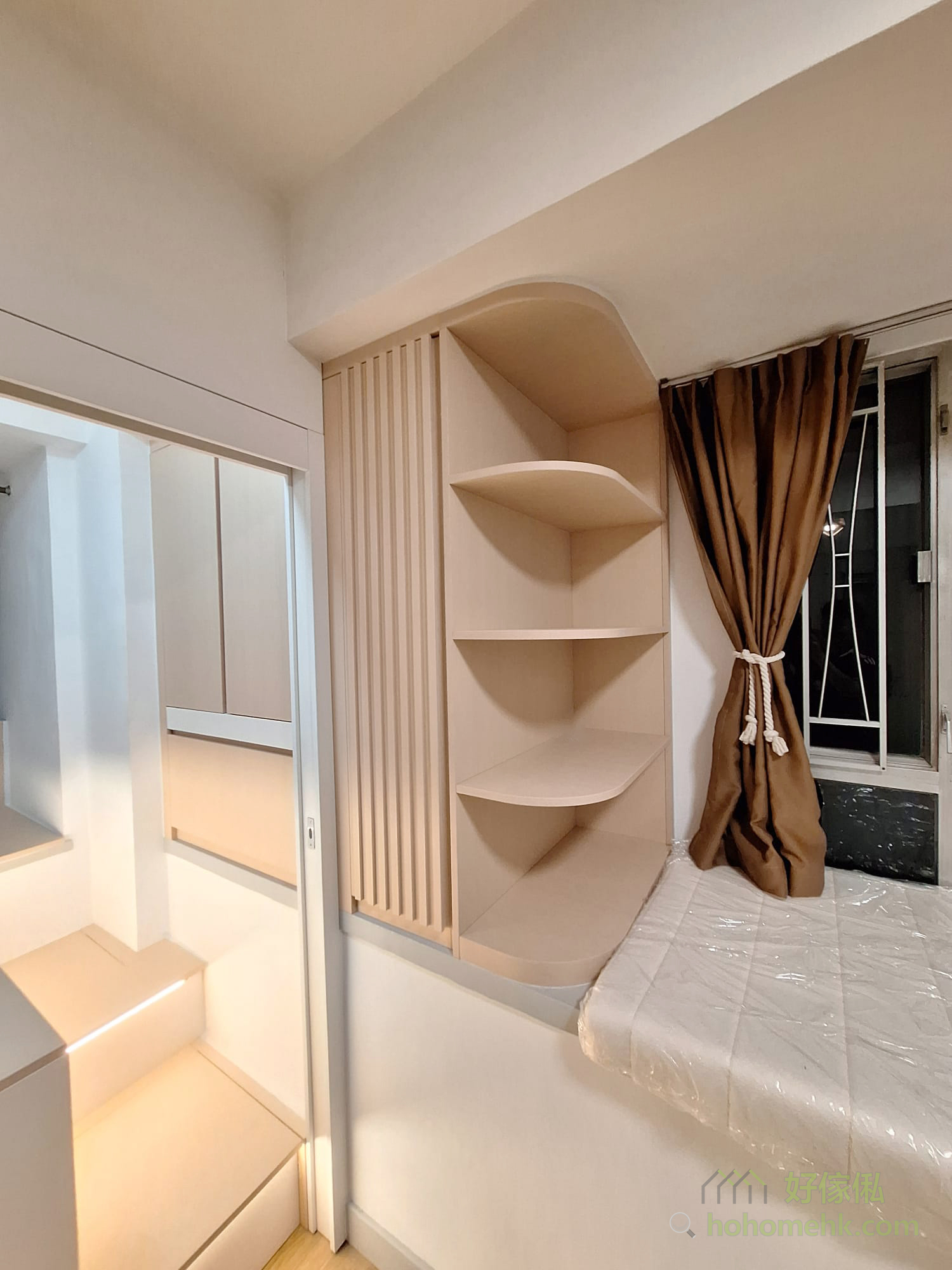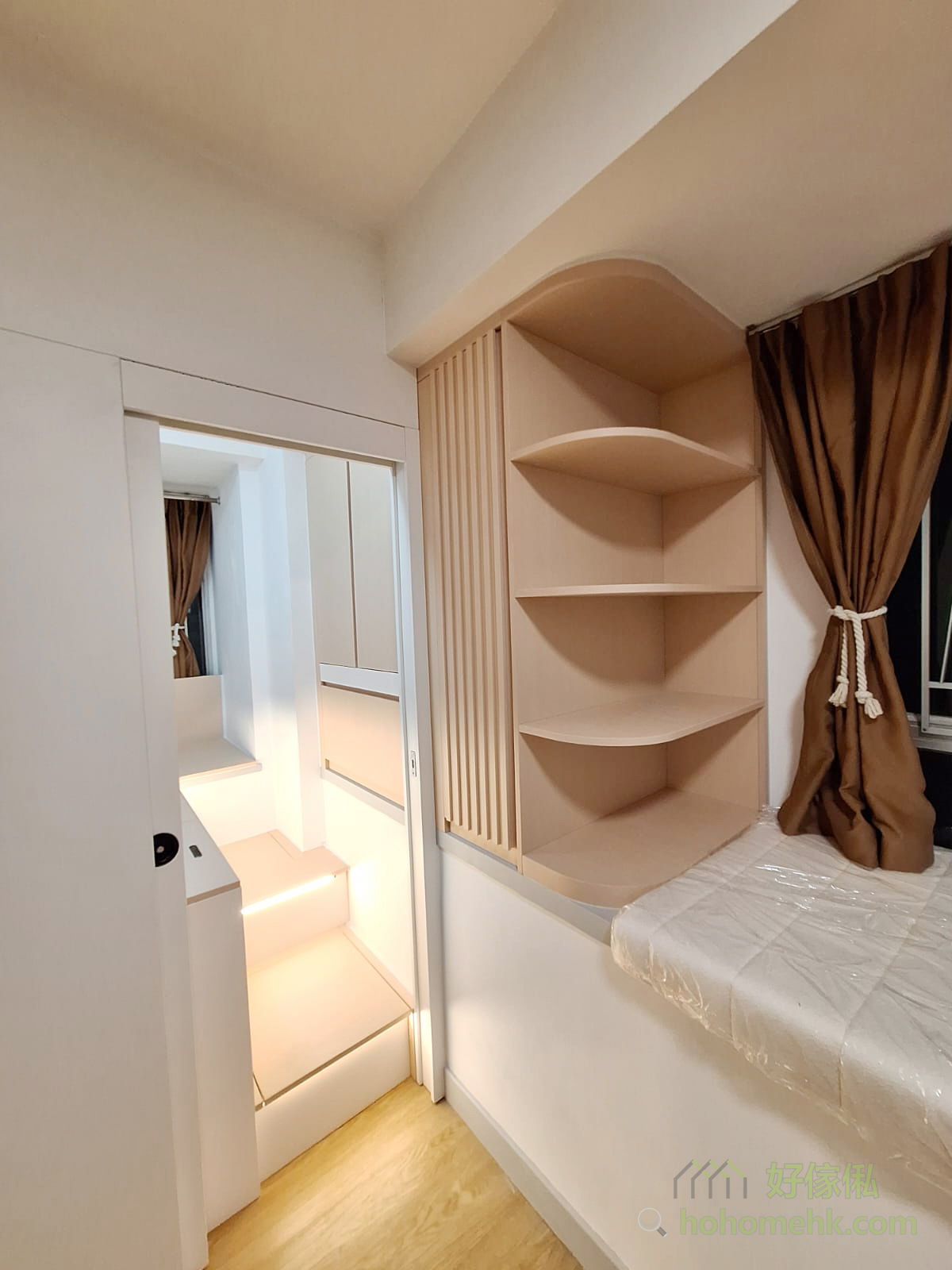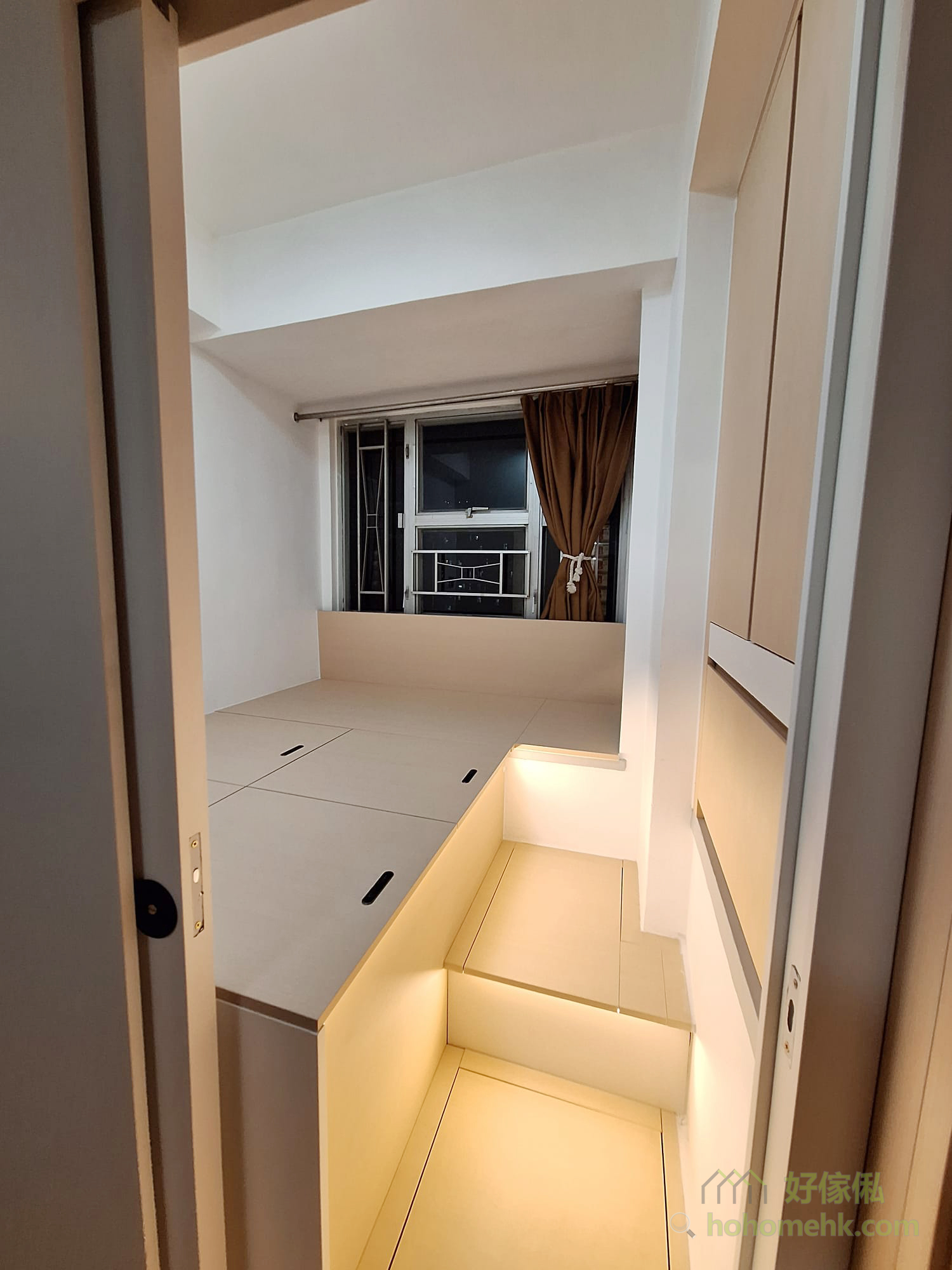 睡房的全房地台設計,不僅提供了超強儲物量,還使房間看起來更加整潔有序。地台的每個儲物格都能靈活收納,方便分類整理,充分利用有限空間。此外,配合趟門設計的衣櫃更顯實用,與地台完美匹配,實現視覺與功能的雙重統一。