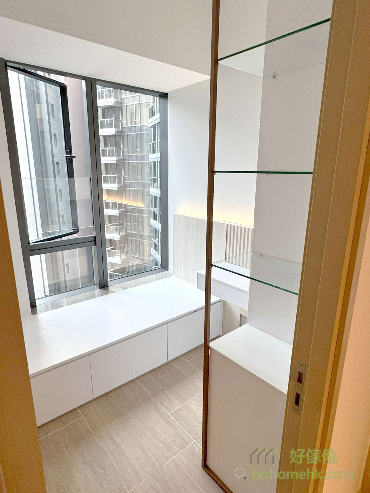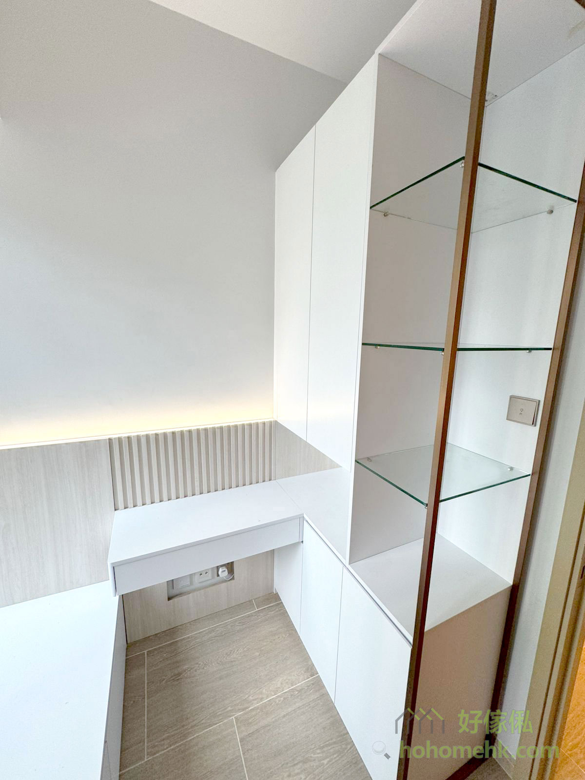 睡房內的懸浮式梳妝枱設計,讓地面保持通透,避免壓迫感。同時,梳妝枱下方空間可輕鬆收納梳妝凳,保持整潔有序。這種設計不但美觀,更方便日常使用,滿足現代細單位的需求。
