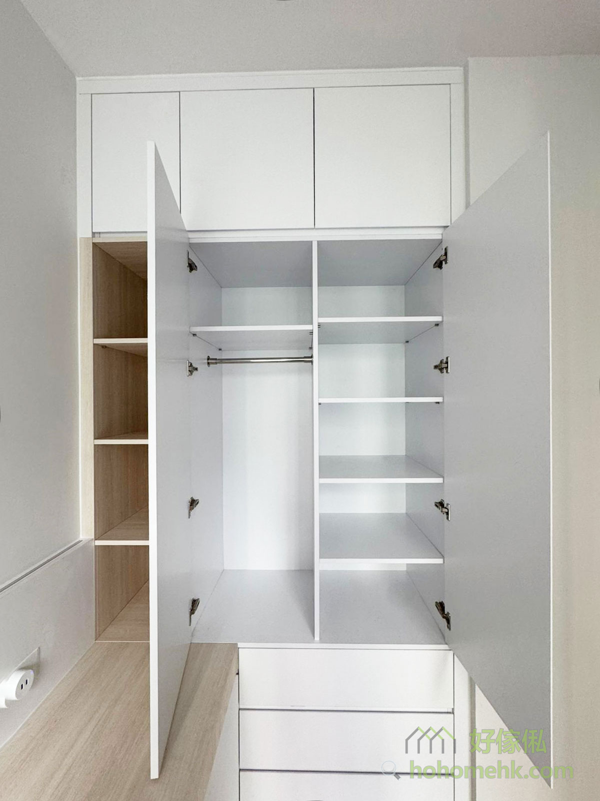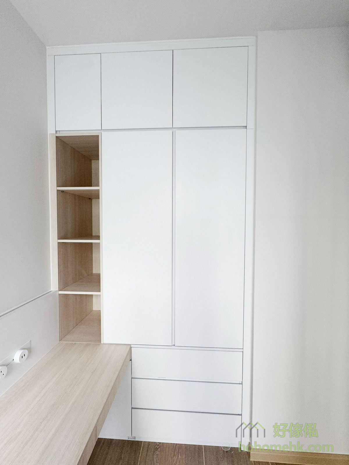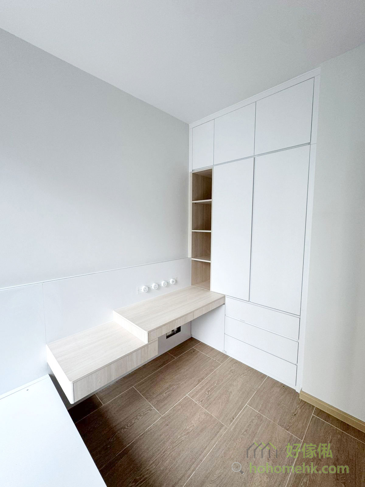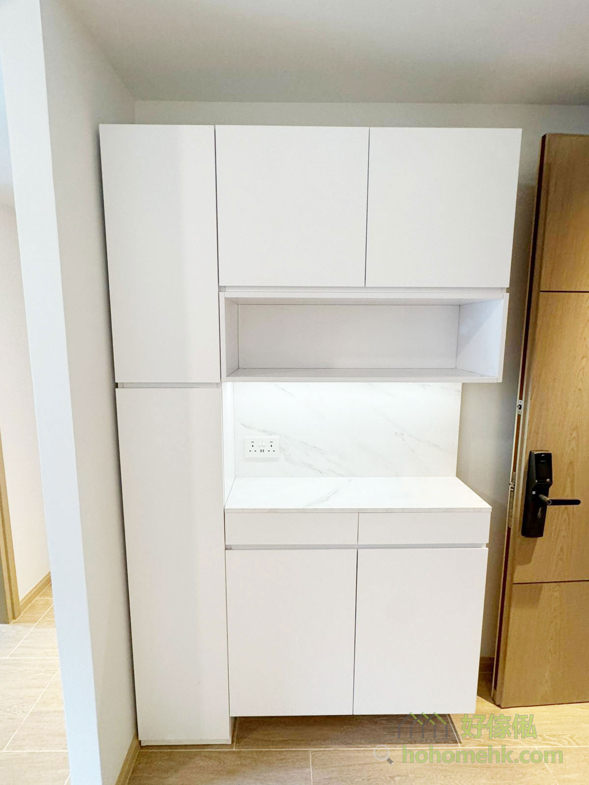全屋以純白色為主調,讓空間看起來更加開闊、明亮,適合細單位的設計需求。櫃身、牆面及系統櫃的白色表面能有效反射自然光,提升整體空間的通透感。在純白基調中加入木色元素,增添自然溫暖感;白雲石紋則提升整體質感,營造優雅且現代的氛圍。