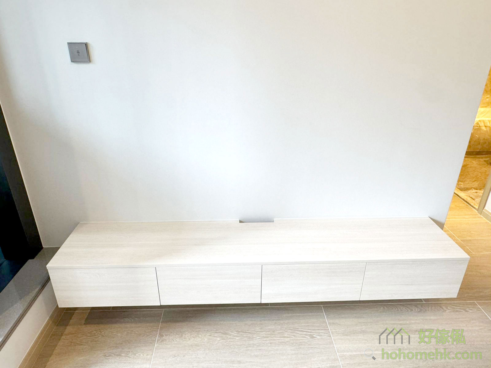 睡房內的懸浮式梳妝枱設計,讓地面保持通透,避免壓迫感。同時,梳妝枱下方空間可輕鬆收納梳妝凳,保持整潔有序。這種設計不但美觀,更方便日常使用,滿足現代細單位的需求。電視櫃同樣採用了懸浮式設計,可以讓客廳擁有更大的空間感。