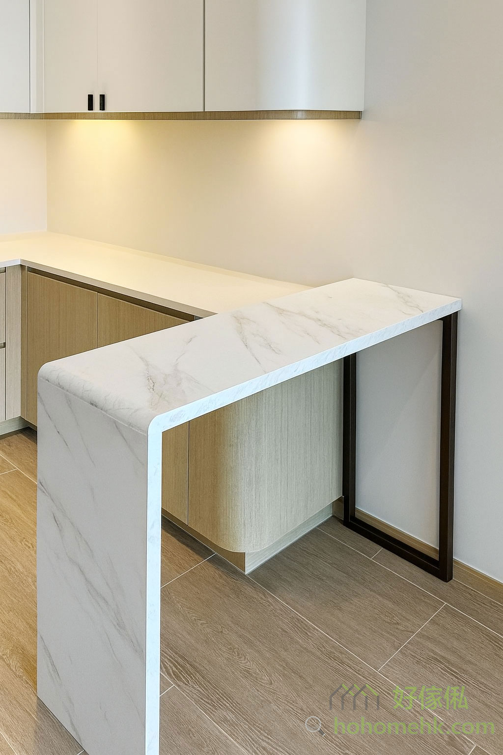 在開放式廚房與客廳之間,安裝一張客製化的高身吧枱,實現了空間分隔的機能,還提供了額外的備餐枱面。吧枱表面以白雲石紋飾面設計,枱邊做了圓邊設計,既耐用又易於清潔。此外,吧枱還能兼作餐枱,讓小空間發揮多機能用途。