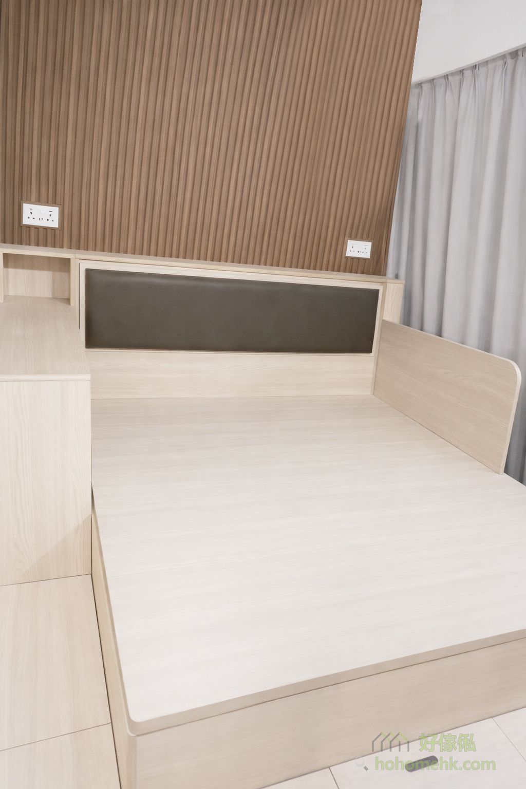 靠窗位置的油壓床特別設計了側板,不僅避免窗簾影響睡眠,還多了一份安全感。這項設計既保護了用戶的隱私,也讓空間更有包圍感,同時亦可以防止床褥移位,為整個睡房增添了貼心的細節。