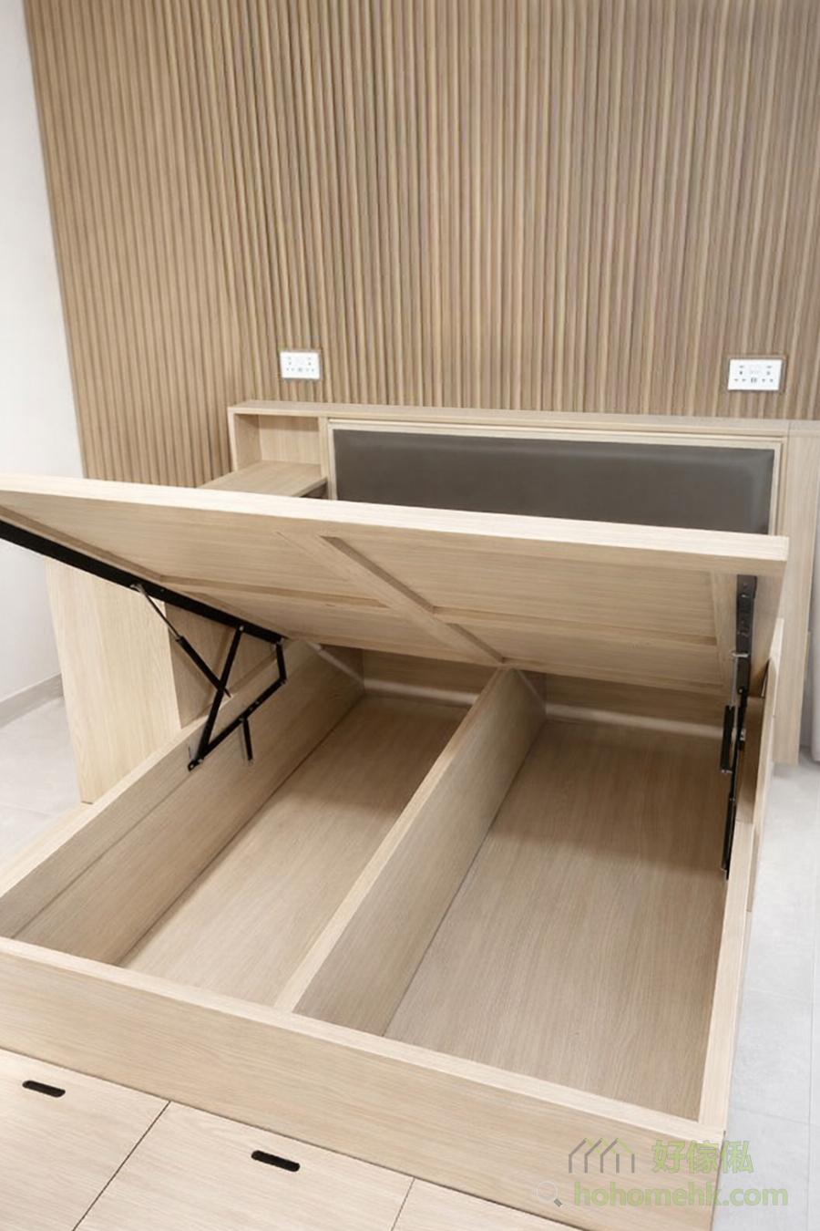 床箱內部採用油壓式設計,輕輕一拉即可揭開,加上還做儲物地台,加高了整體的收納量,內部儲物空間非常充裕,可用於存放被褥、換季衣物等。這樣的設計充分利用了床底空間,對於香港的細單位而言,是解決儲物問題的最佳方案。