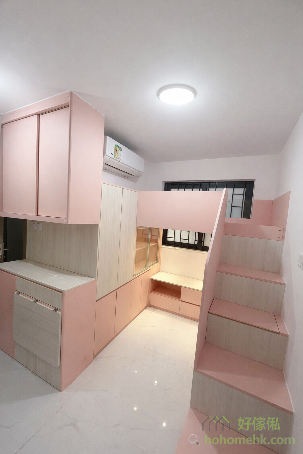 上床下書枱的設計,樓梯延伸出多用途的儲物櫃,充分利用垂直方向的空間,增加儲物空間。使用粉紅色與淺木色作搭配,既保持統一家居風格,亦創造柔和舒適的視覺效果。同時,這樣的設計亦具有兼顧機能性與審美的平衡。