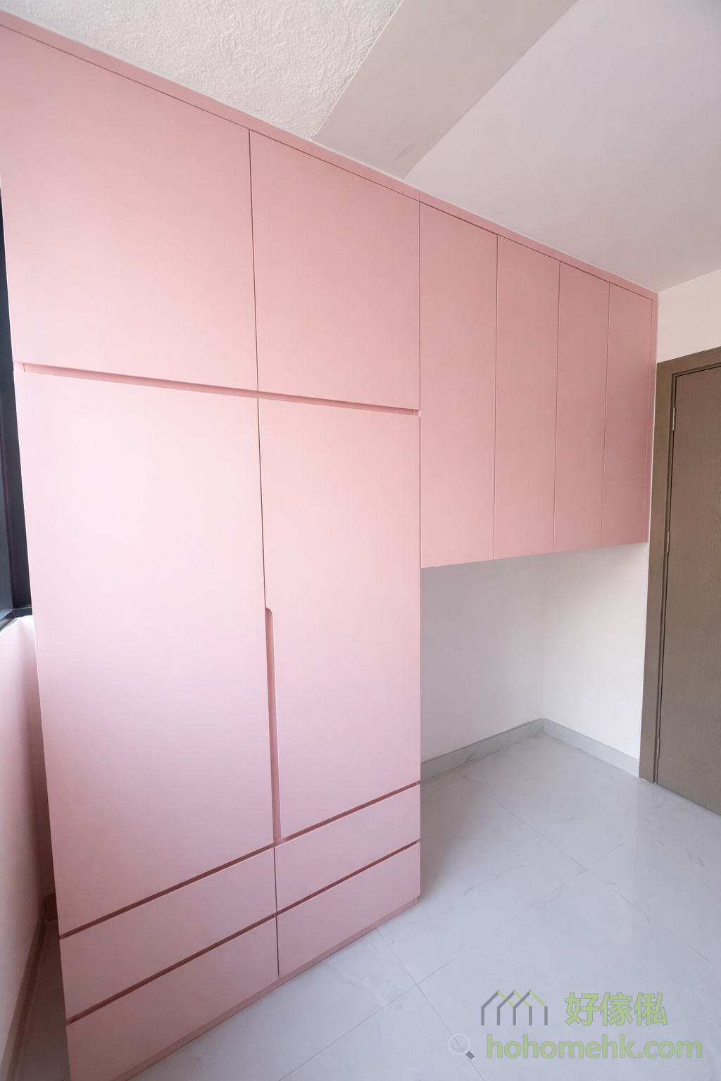 粉紅色是一種柔和溫暖的色調,非常適合營造家居的溫馨氛圍。在全屋傢俬以粉紅色為主題時,可利用好傢俬提供的多款色板,選擇不同深淺的粉紅色調。由櫃門到櫃身都使用統一顏色,無論是衣櫃、樓梯櫃還是地台床,都能夠提升整體視覺的協調性。此外,適量加入白色或淺木色拼色設計,既能增加層次感,也能避免過度單調。