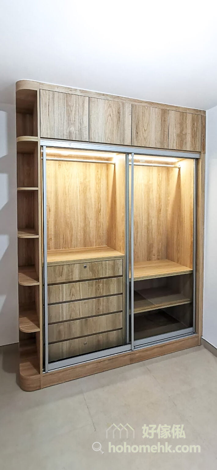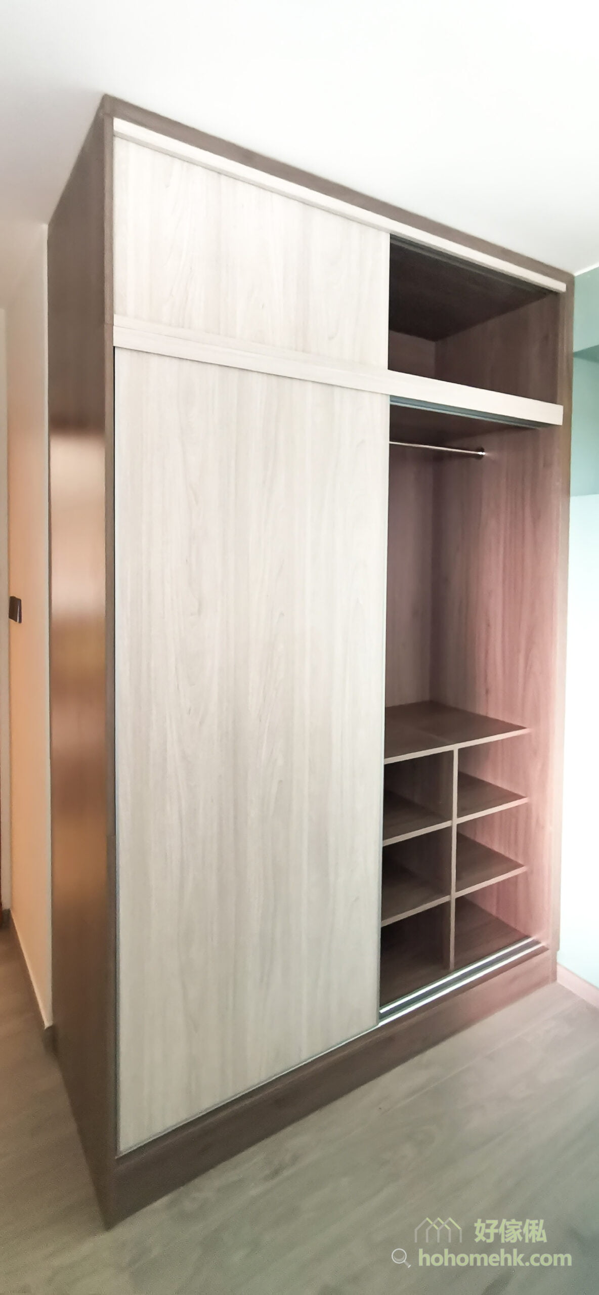 案例中選用一深一淺的拼色配搭,輕易就營造出層次感,深色板材做外殼,視覺上可以令衣櫃有縮小的感覺