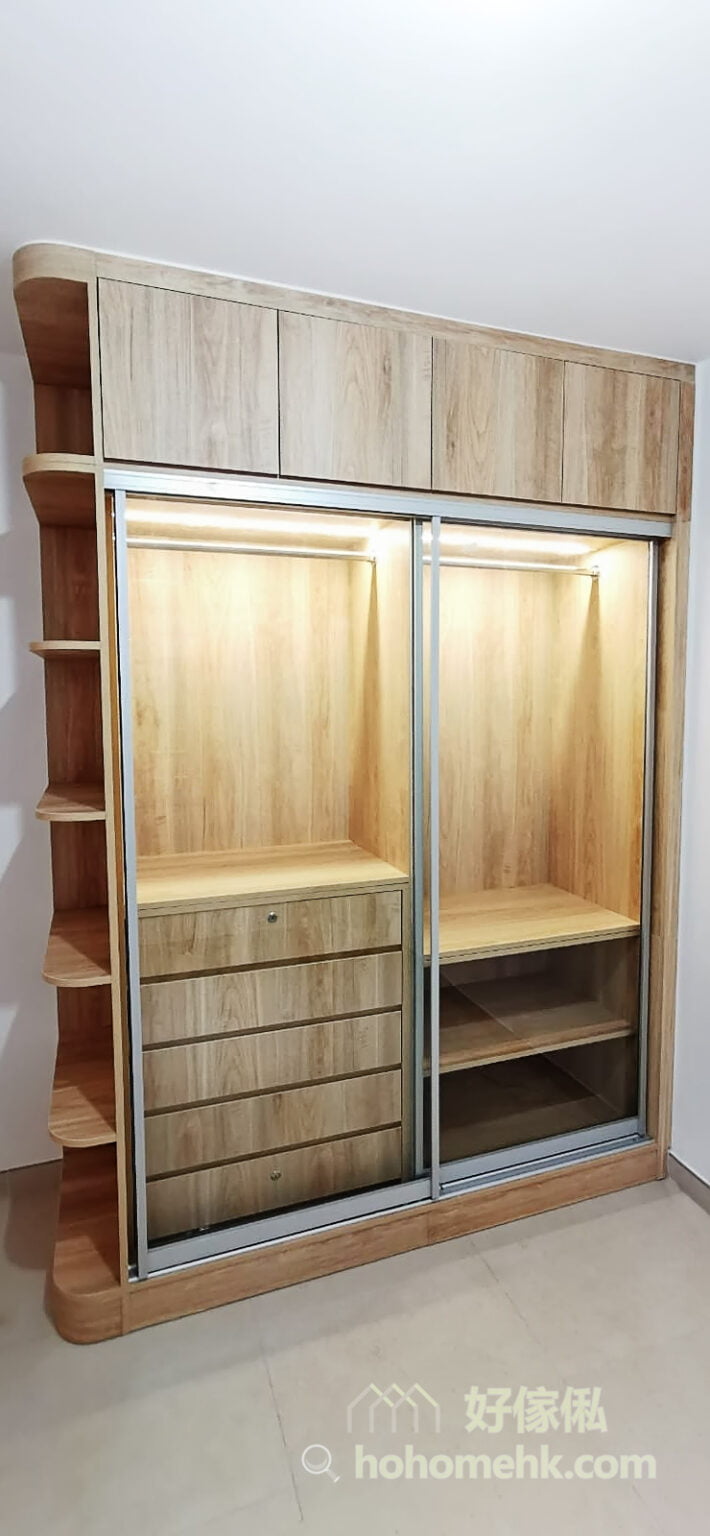 配備燈光的衣櫃亦滲透著陳列室的高級質感,讓你在家裡也有如在精品店逛街的感覺,非常適合對生活質感有所追求的用戶,也適合用於有獨立衣帽間的單位。