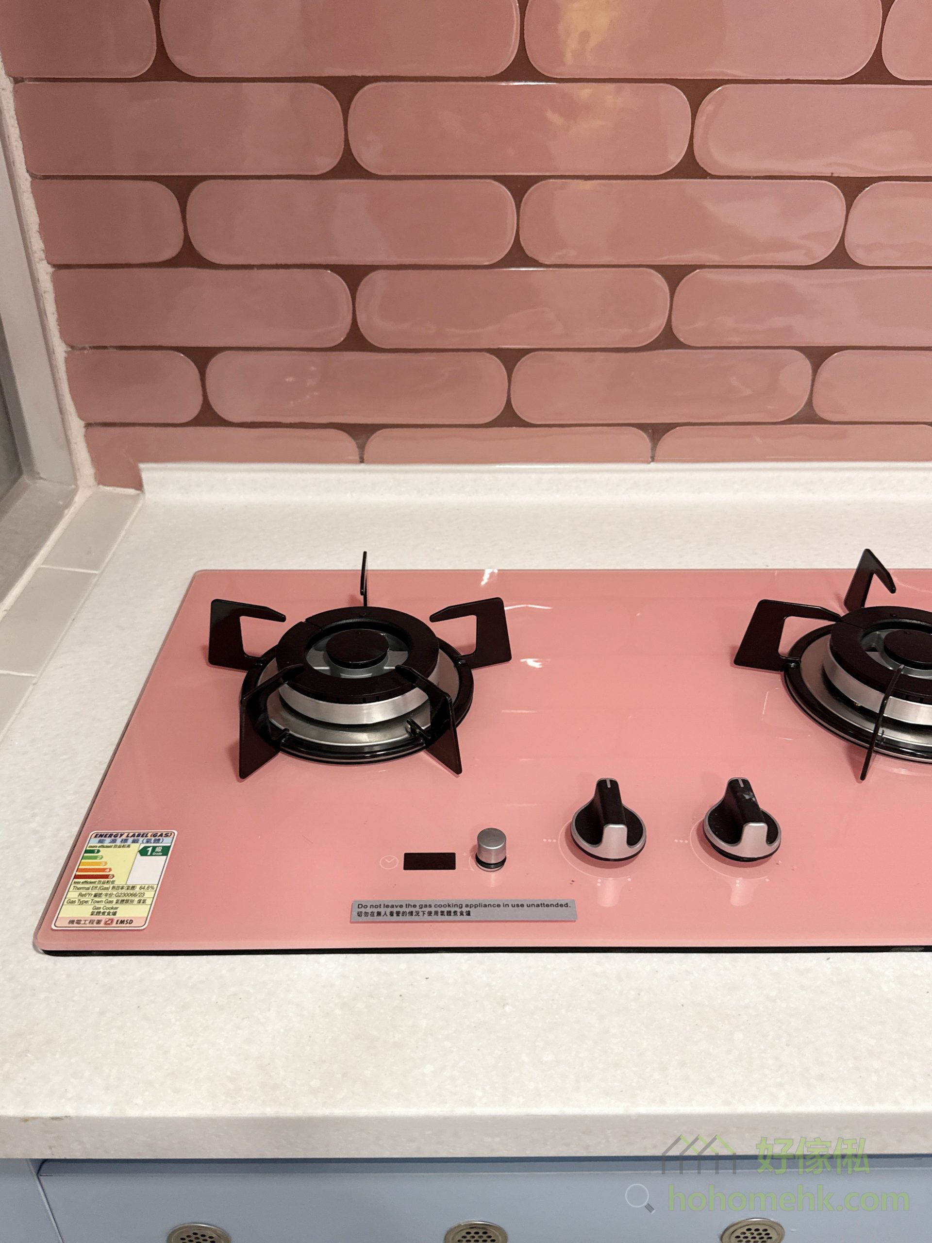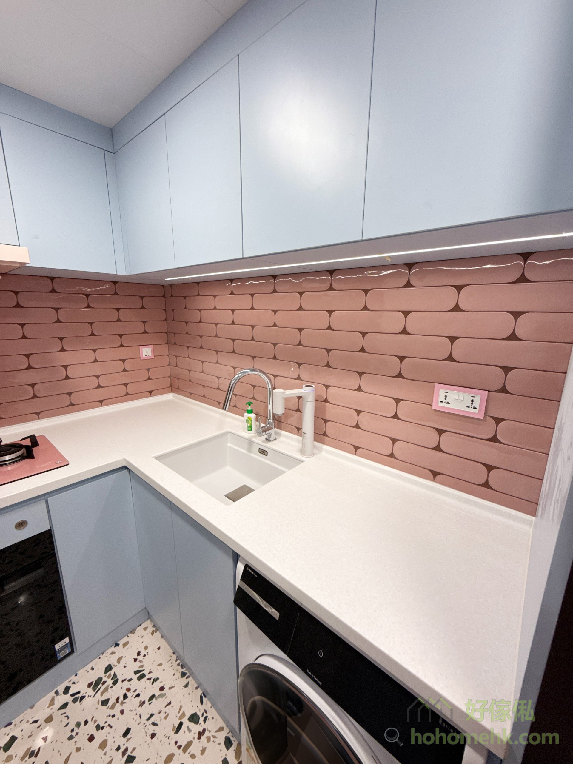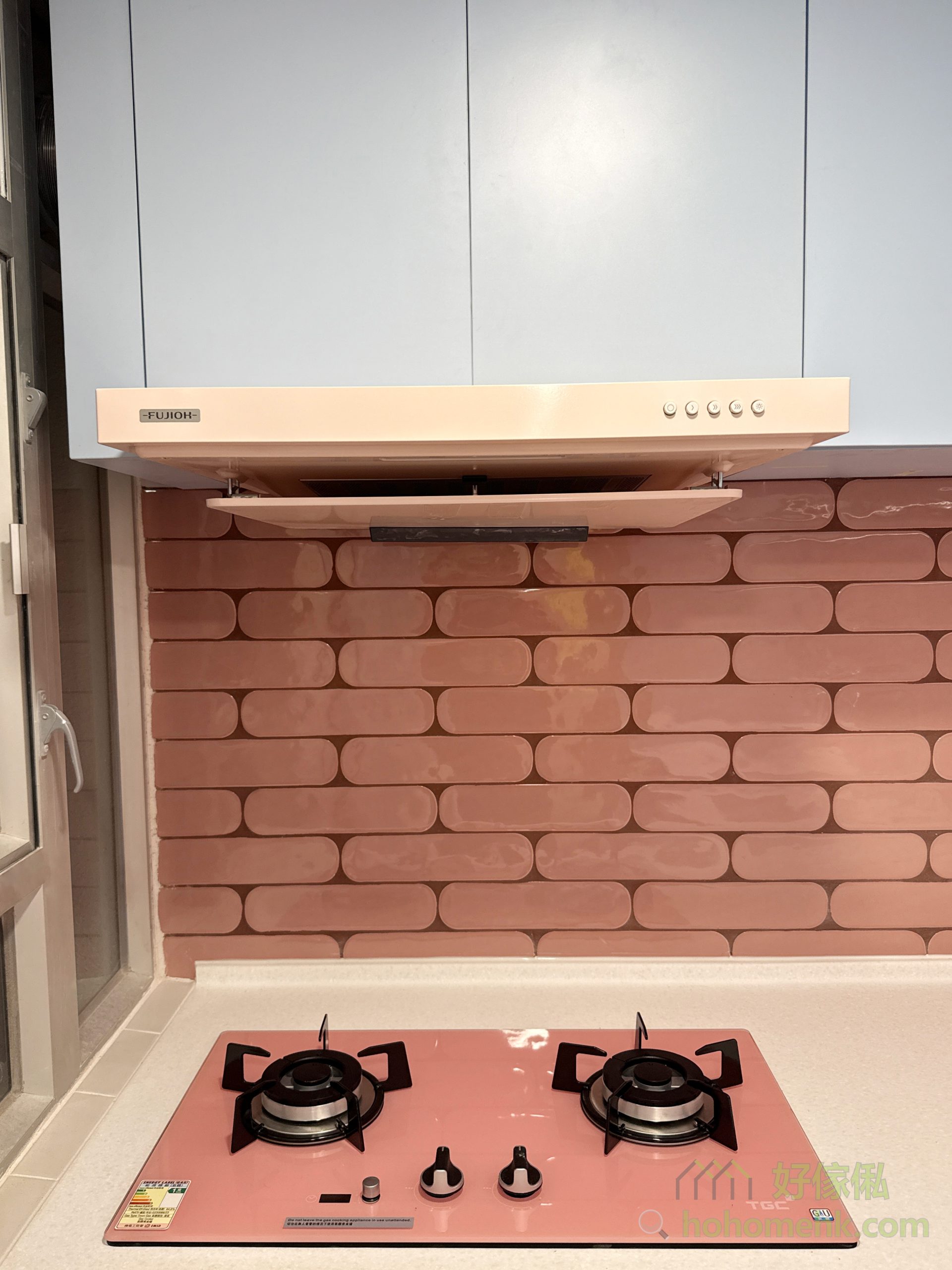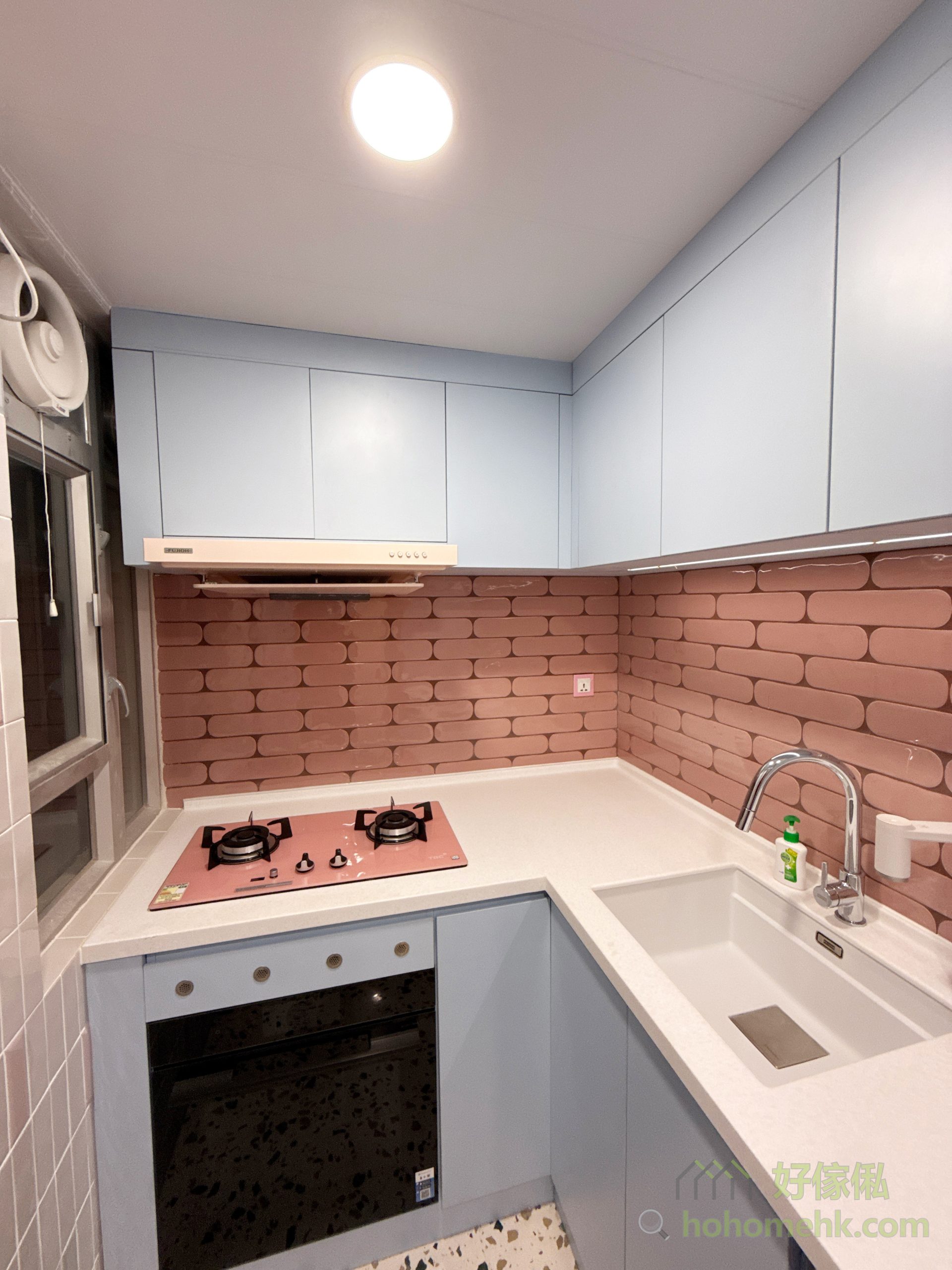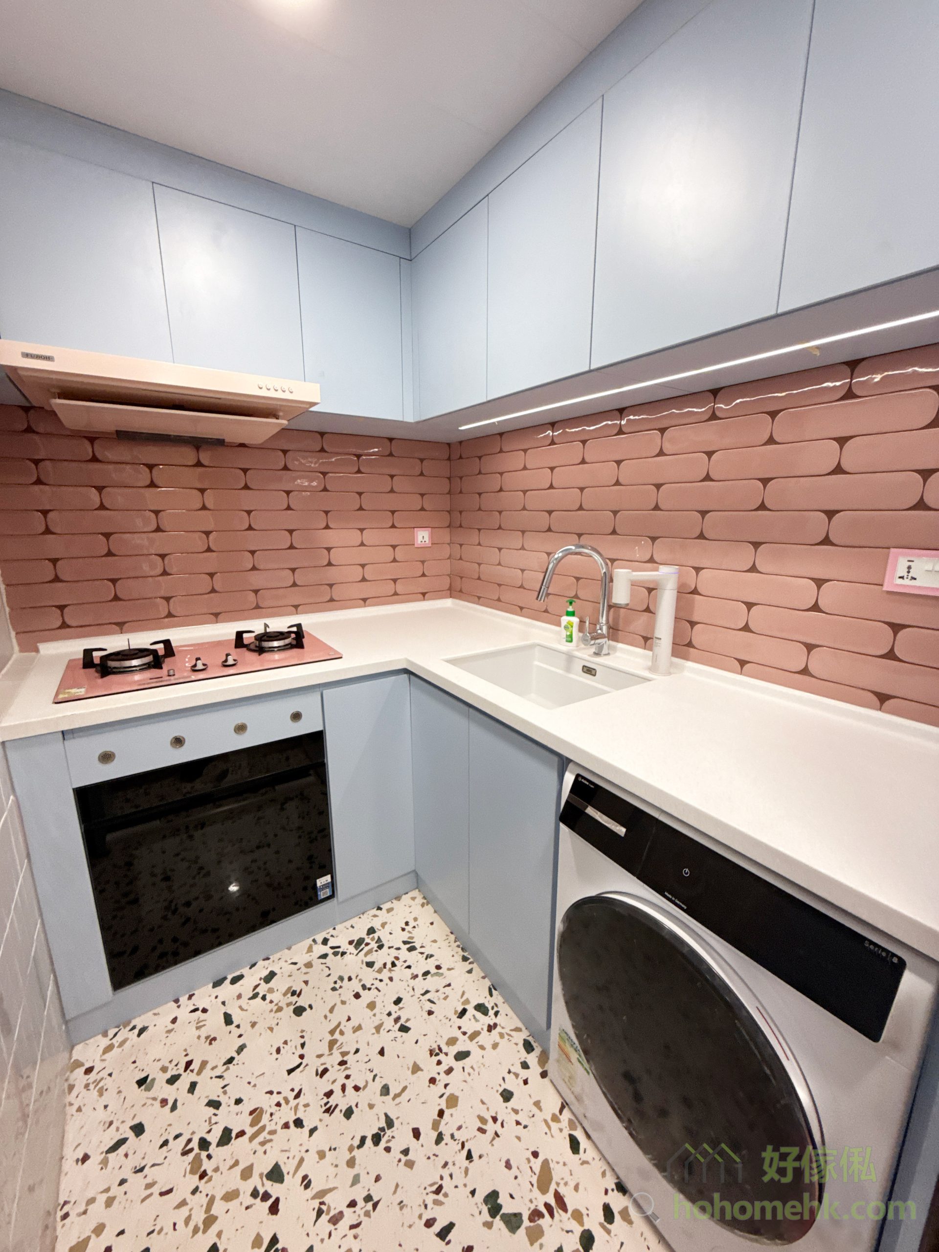 天藍地櫃與粉紅煮食爐的夢幻搭配