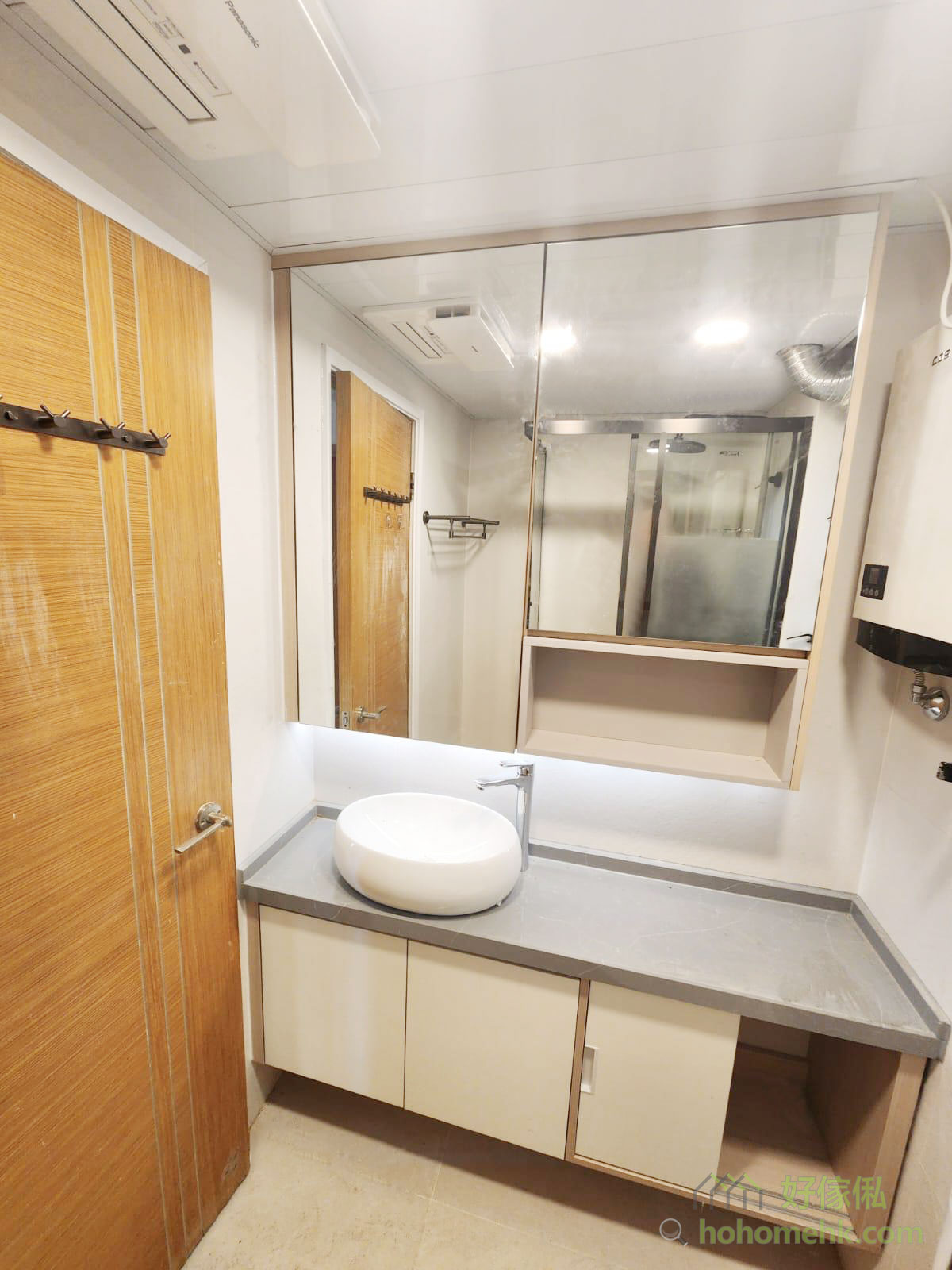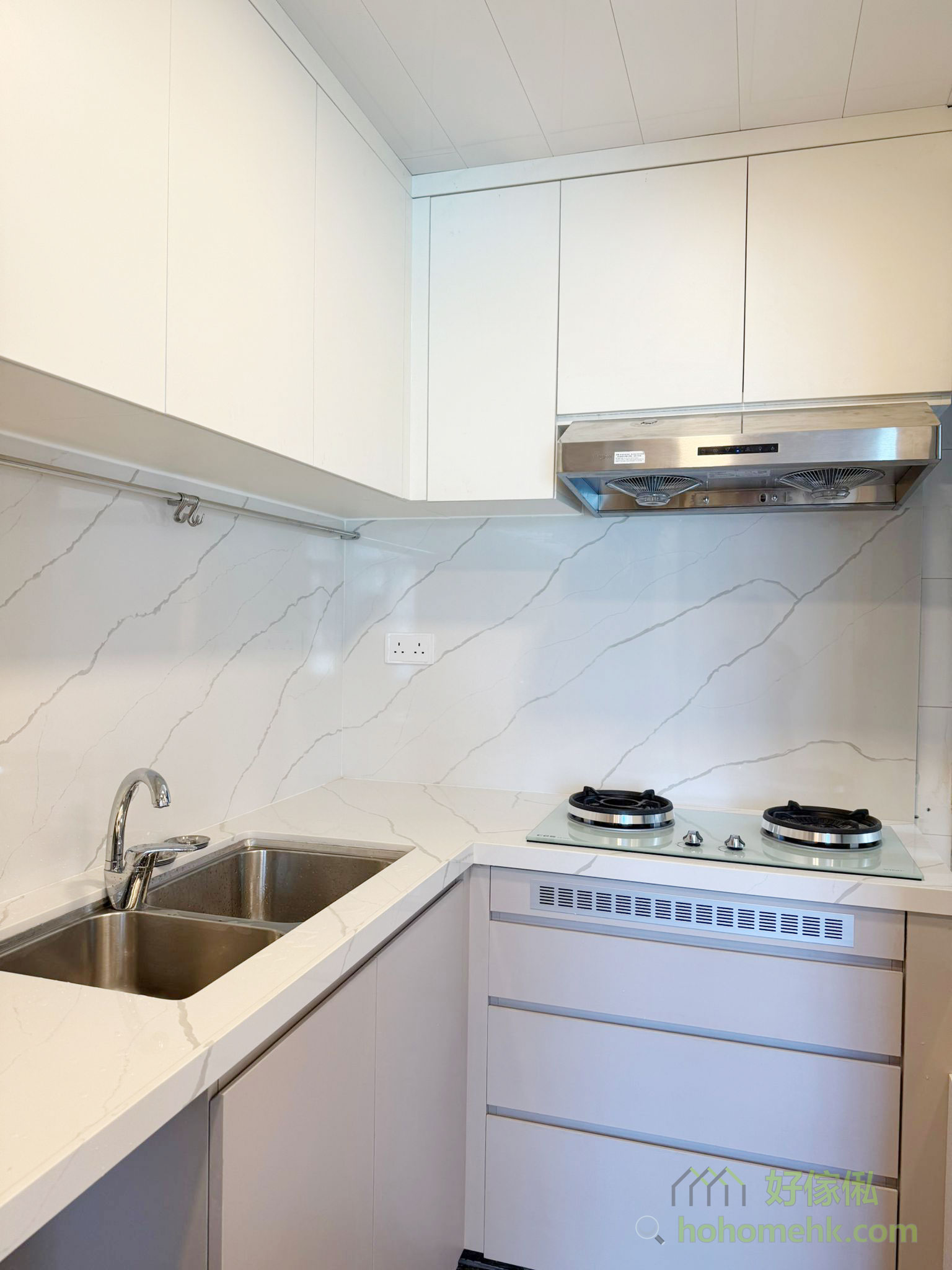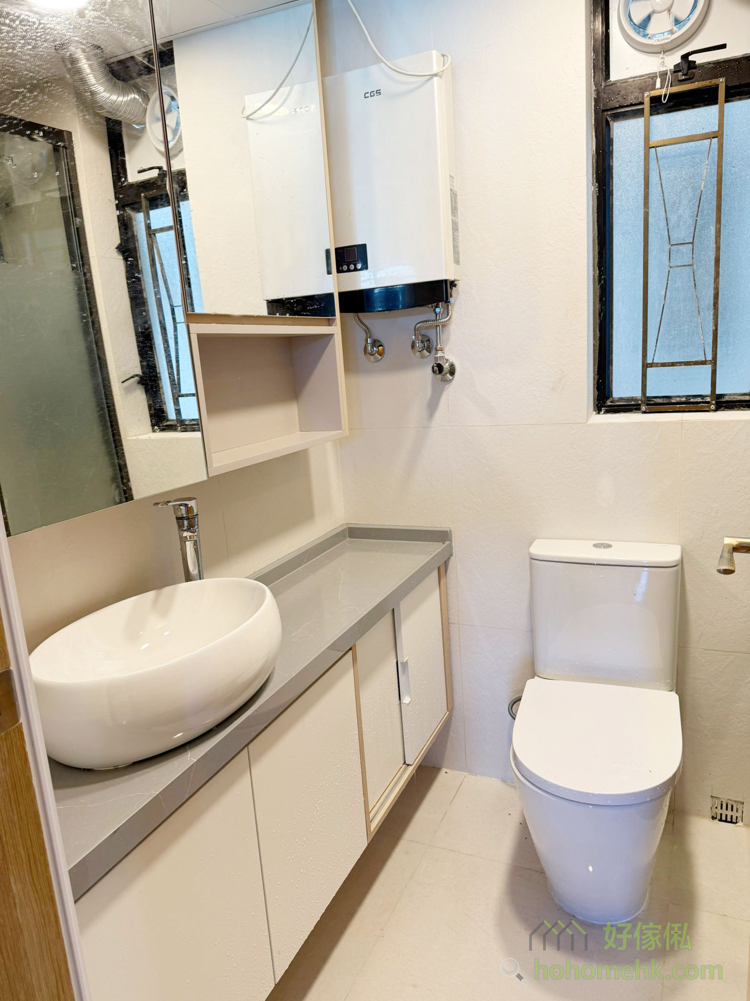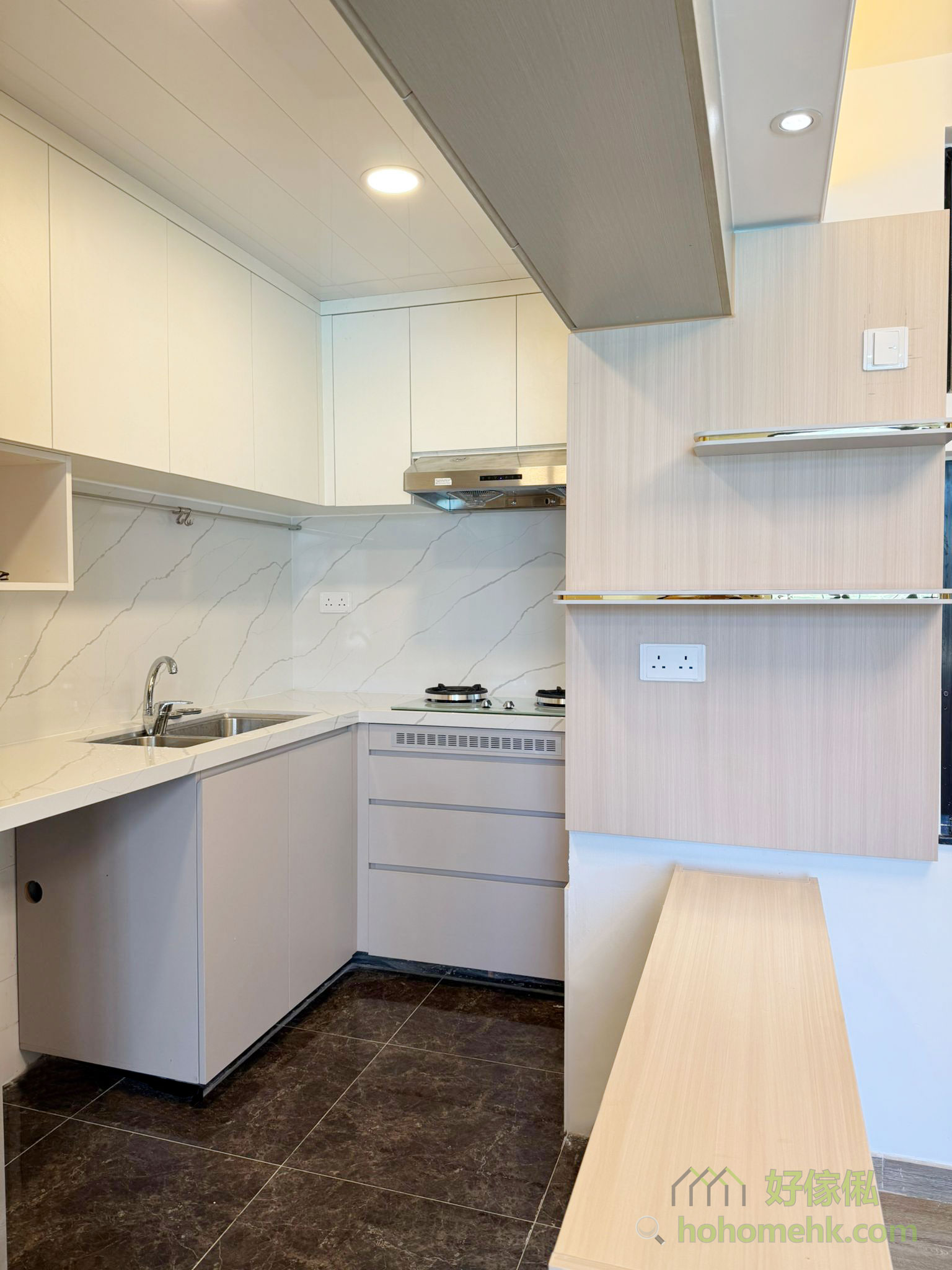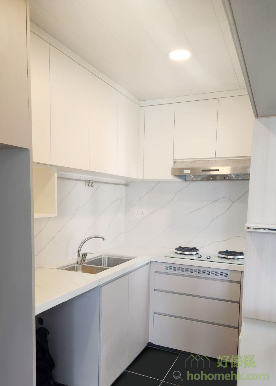 廚具、浴櫃及客廳、睡房的客製化系統櫃均採用相同的材質及設計風格,令整個單位的視覺效果顯得更為統一。無論是廚房的潔白牆身,還是浴室的簡約線條,每一件客製化系統櫃都體現了細緻的工藝。開放式廚房選擇灰杏色和大面積的奶油色,使整個客廳空間顯得更寬敞光亮。