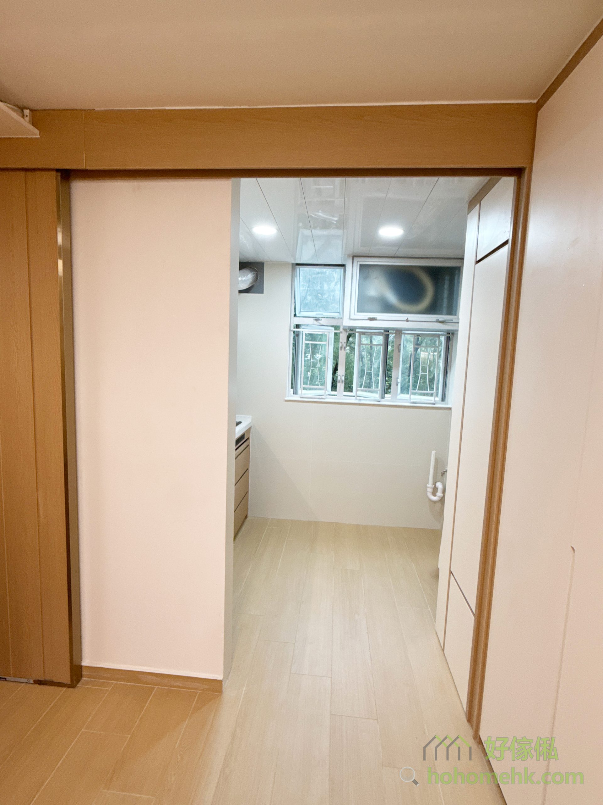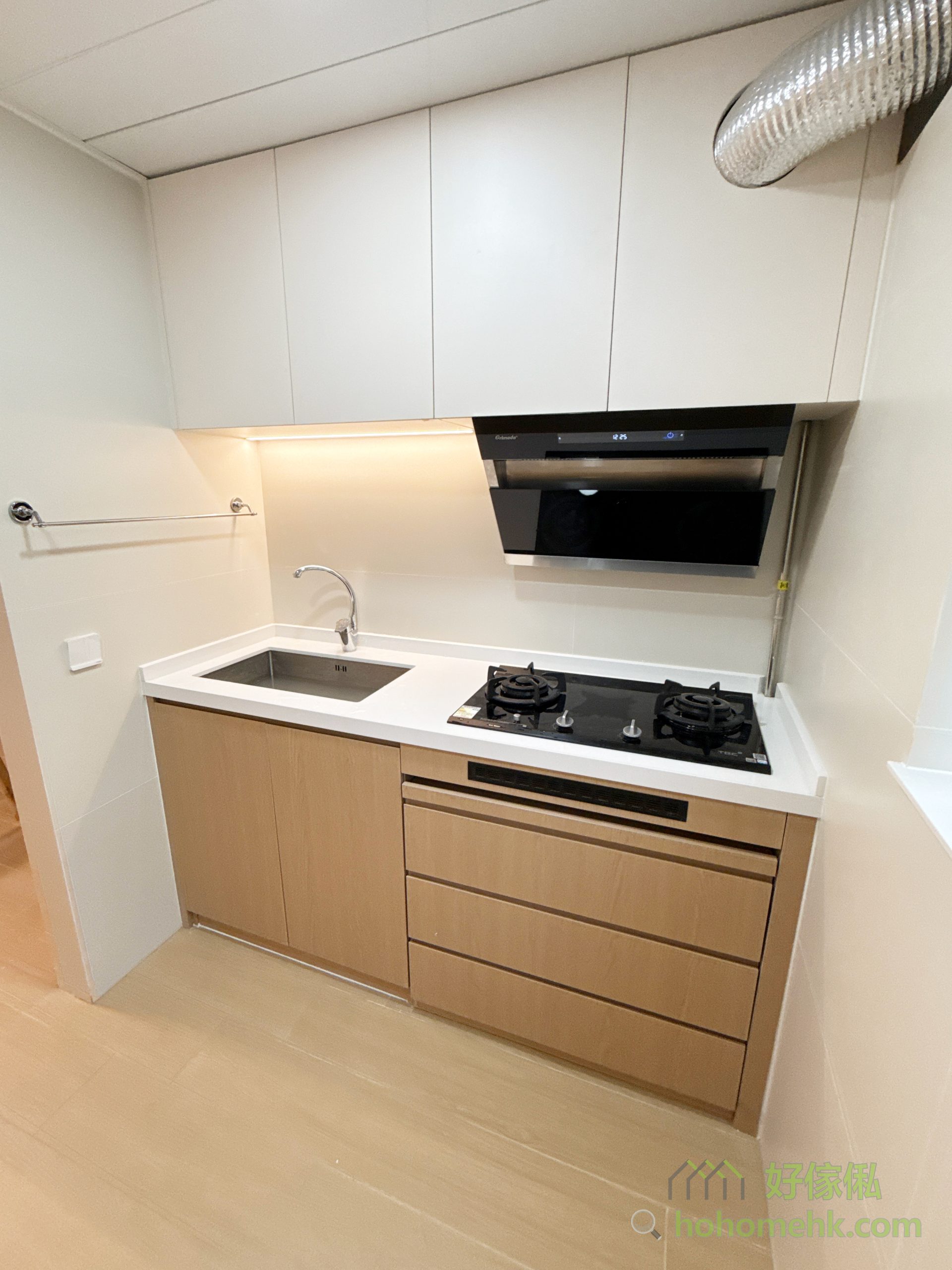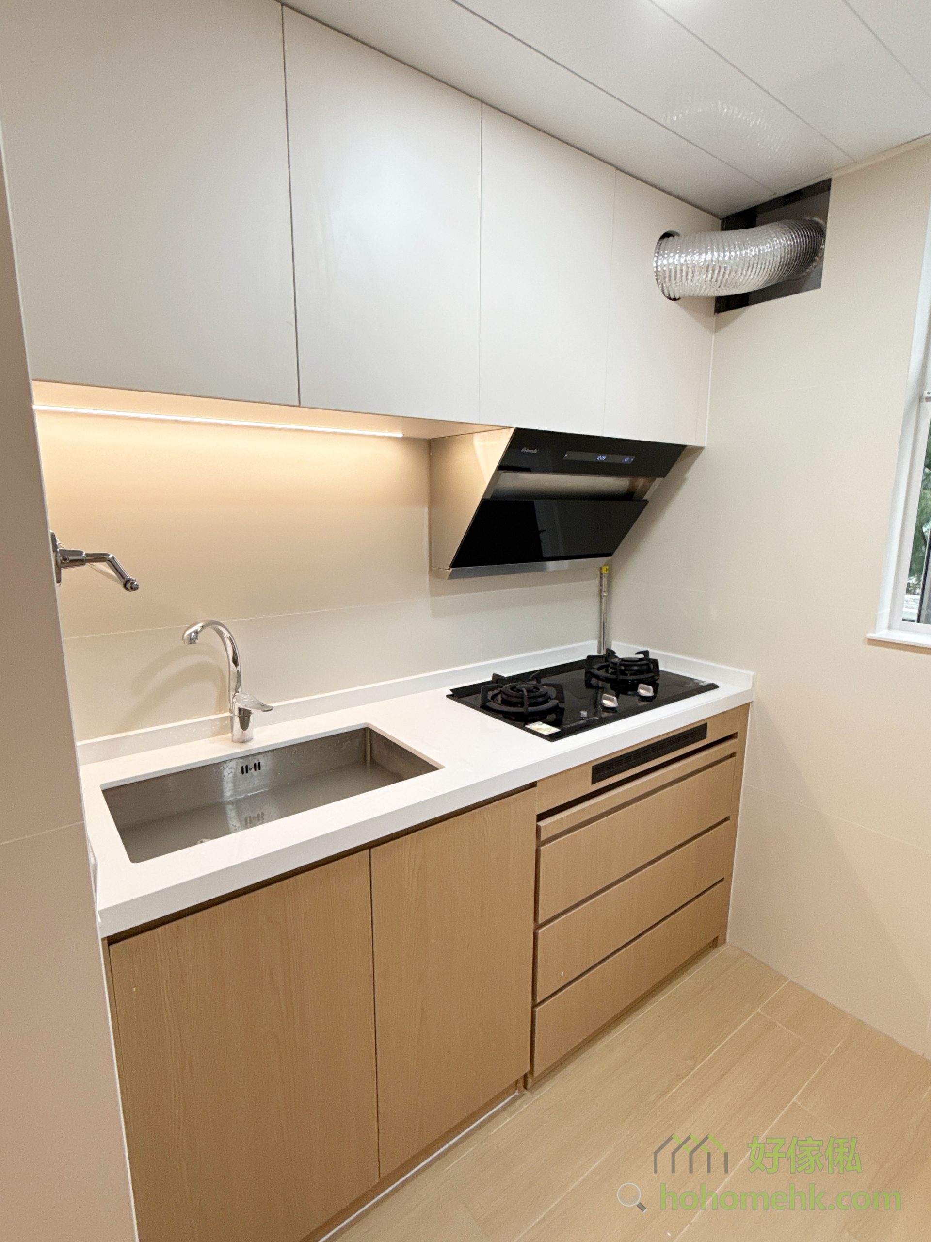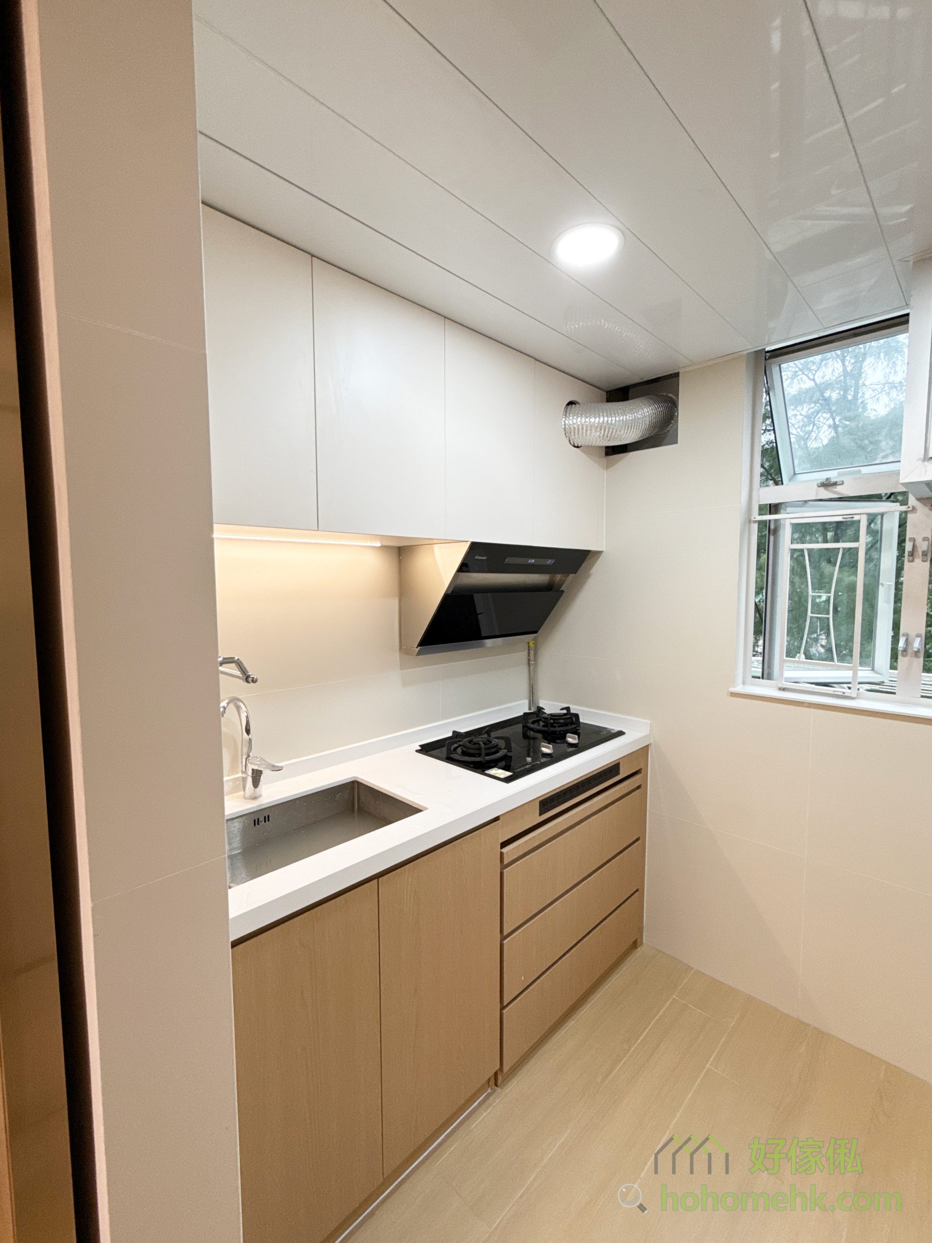 將煮食爐設置在窗邊,不僅讓油煙機的氣喉能採用更短的路線直接通往室外,還能節省吊櫃內部的空間,增加收納的靈活性。這種設計充分利用了日式廚房強調的實用性原則,保證烹飪空間的整潔與高效運作,而吊櫃的精心佈局則為儲物提供更多可能。